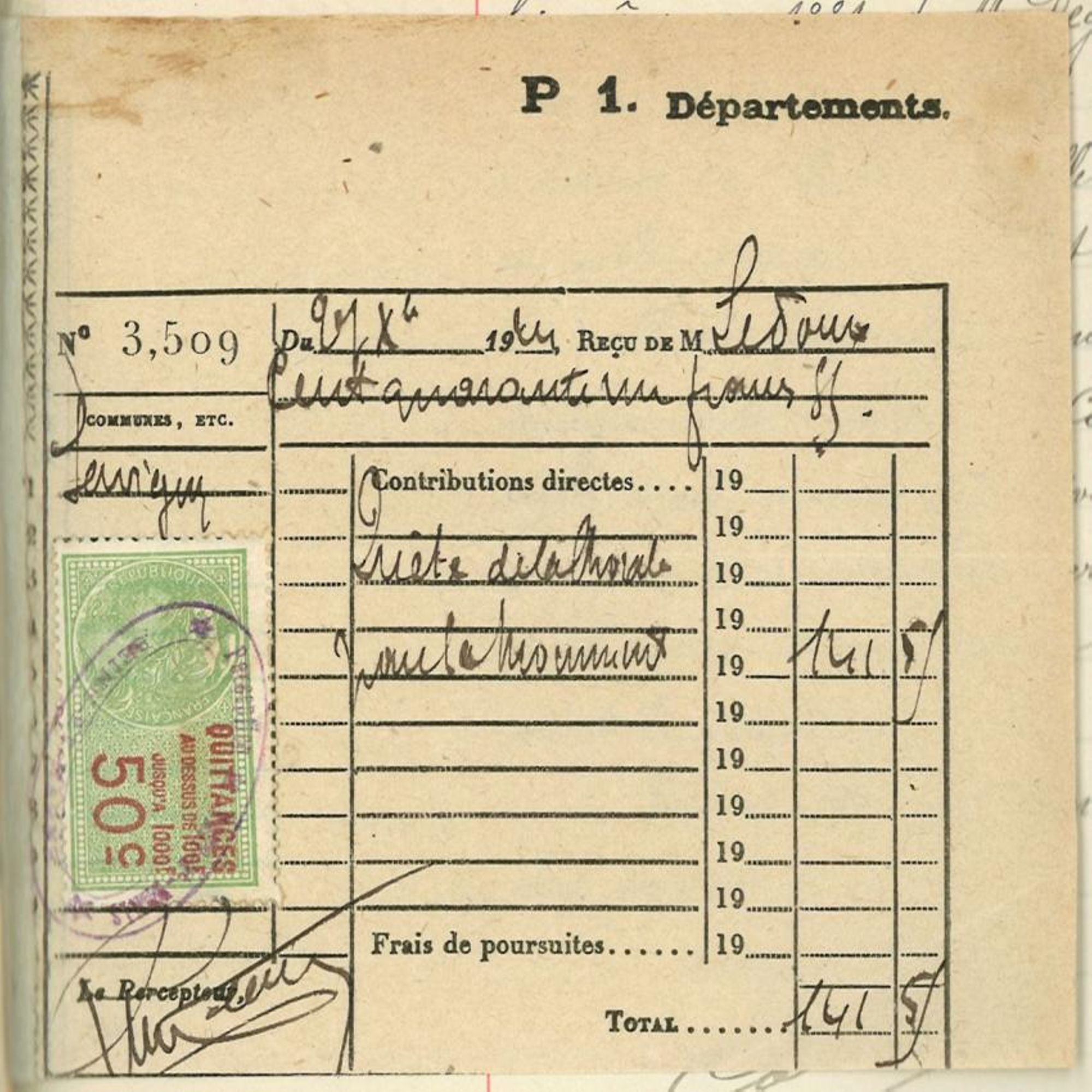 * par M. Ledoux Léon, peintre, membre de la "Chorale" à Savigny, d'une somme de cent quarante et un francs cinquante-cinq centimes (141,55 Francs), produit de la quête faite par la même société, et pour le même objet, lors de son concert de 1924