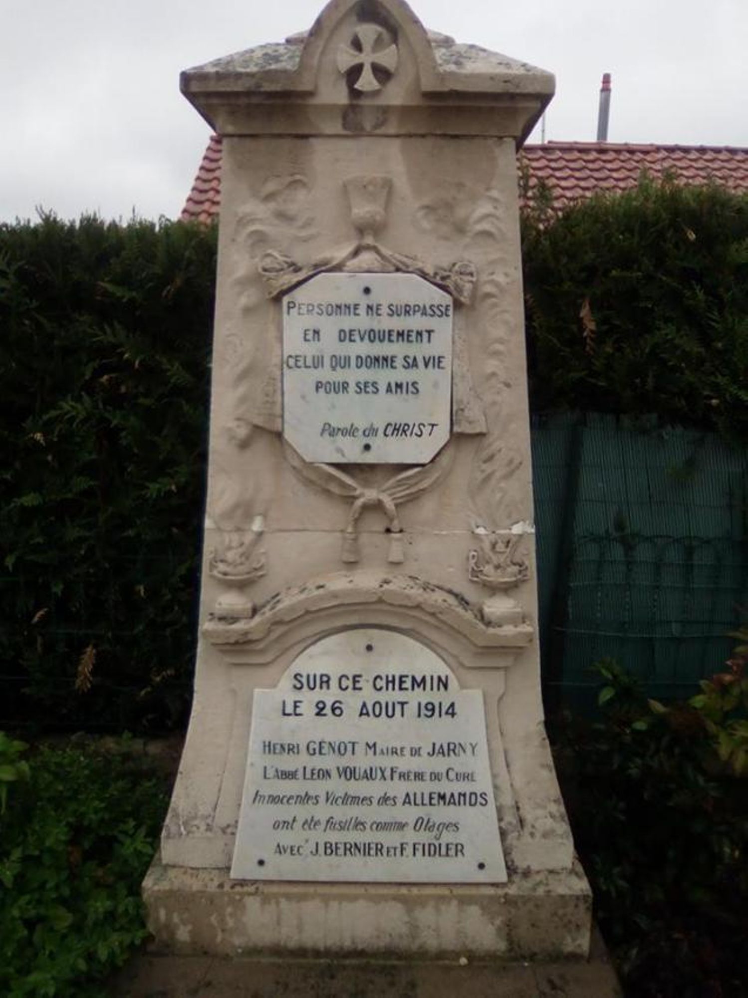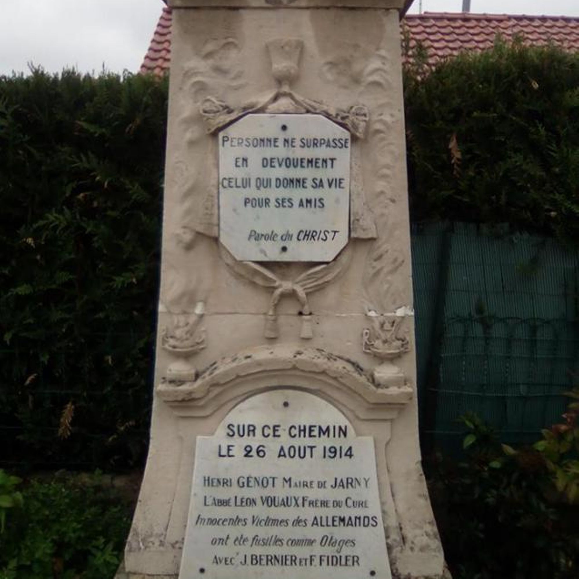 - Érigé à l’endroit même où les quatre otages jarnysiens ont été fusillés au matin du 26 août 1914, il est l’œuvre de l’atelier DROUOT de Nancy. Il est venu remplacer un monument beaucoup plus modeste : à l ’origine en effet, l’emplacement de l’exécution du 26 août n’était marqué que par une simple croix de bois