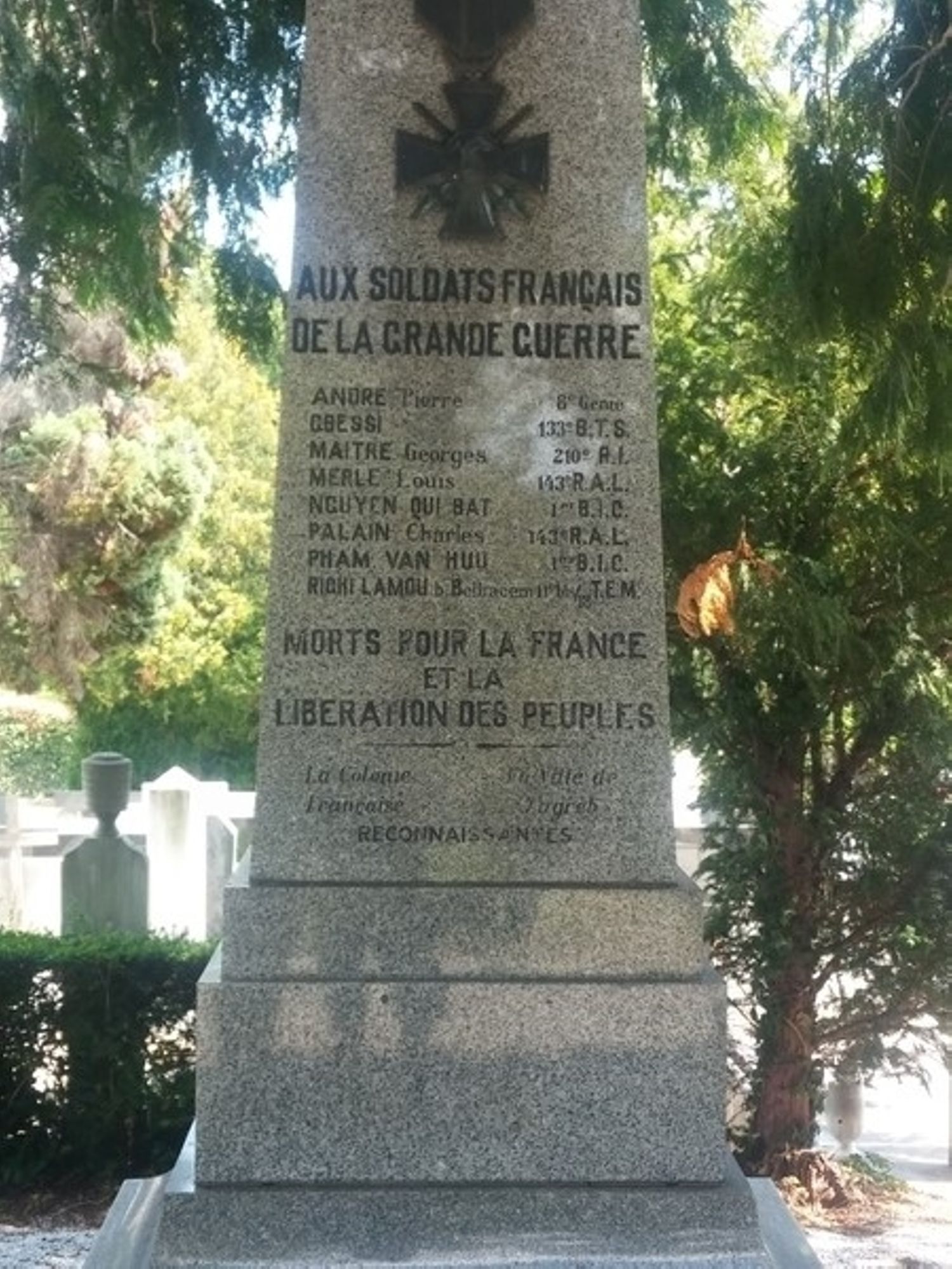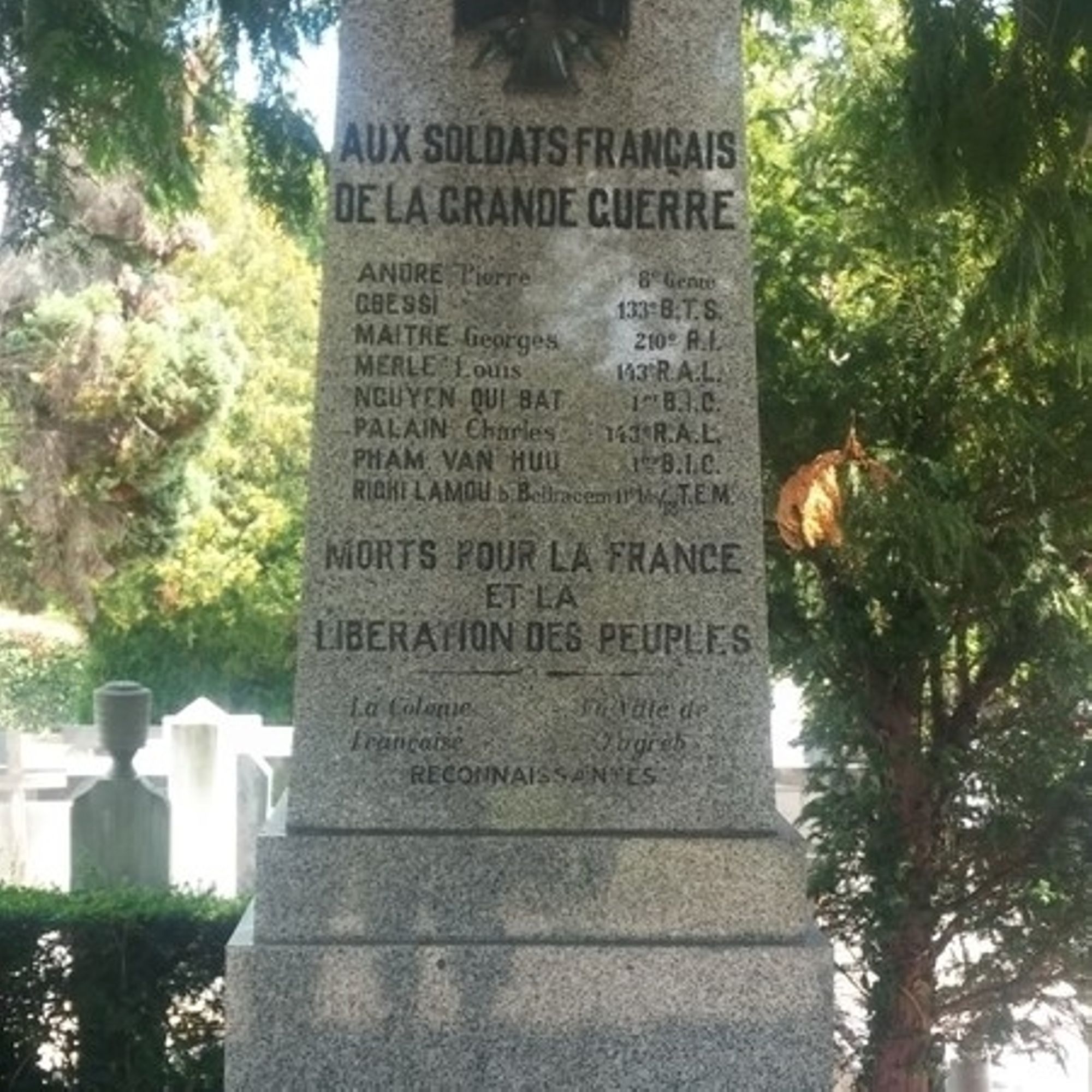 - Huit soldat « Mort pour la France » durant la Grande Guerre sont inhumés dans un carré du cimetière municipal de Mirogoj, situé à Zagreb. Ces huit soldats qui appartenaient à l’armée d’Orient sont morts entre mars et juin 1919. Un monument érigé à leur mémoire mentionne six soldats français et deux soldats d’origine vietnamienne « Mort pour la France et pour la libération des peuples ». A côté du monument, deux stèles ont été érigées à la mémoire des deux soldats vietnamiens. Le monument a été érigé par la colonie française de Belgrade.