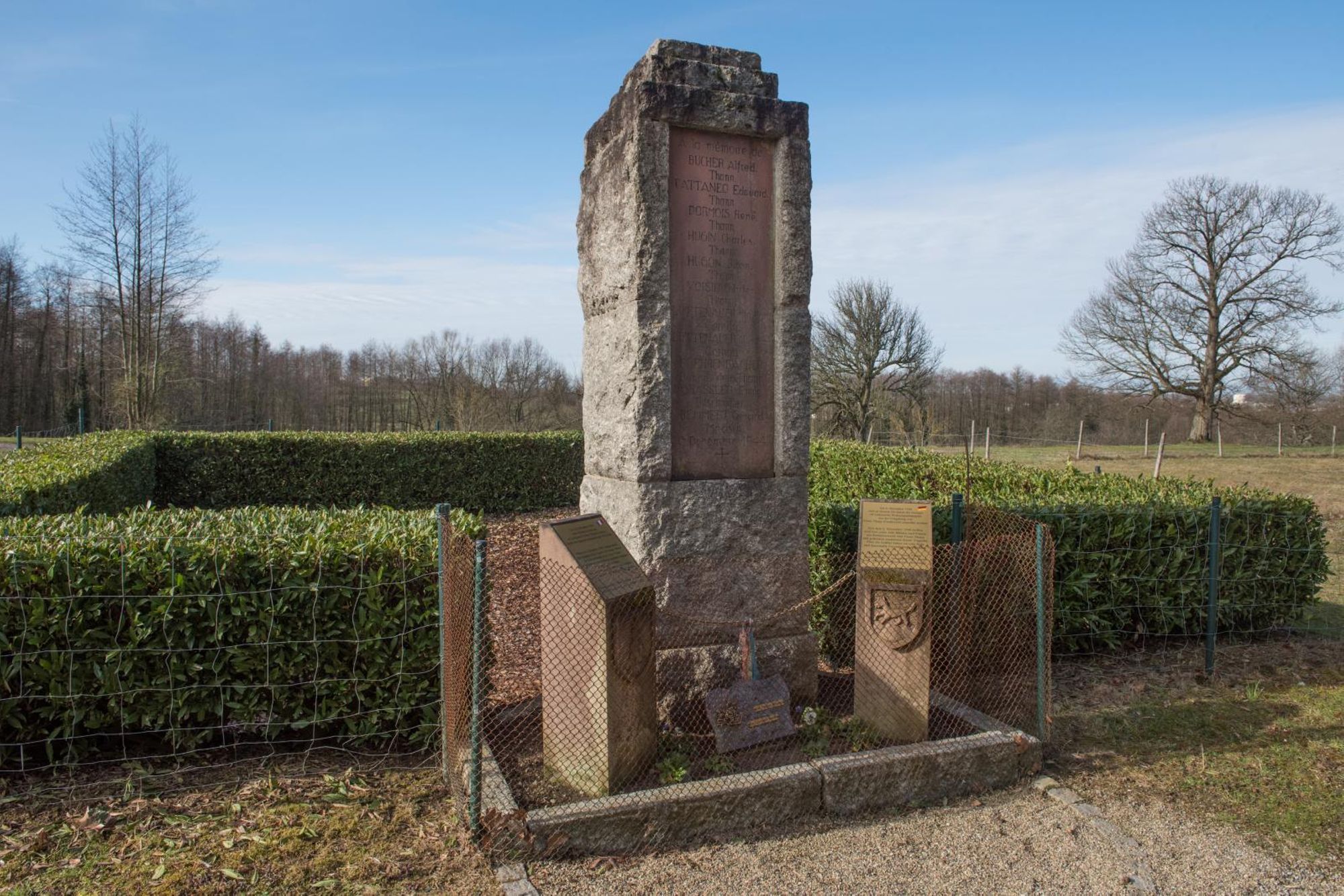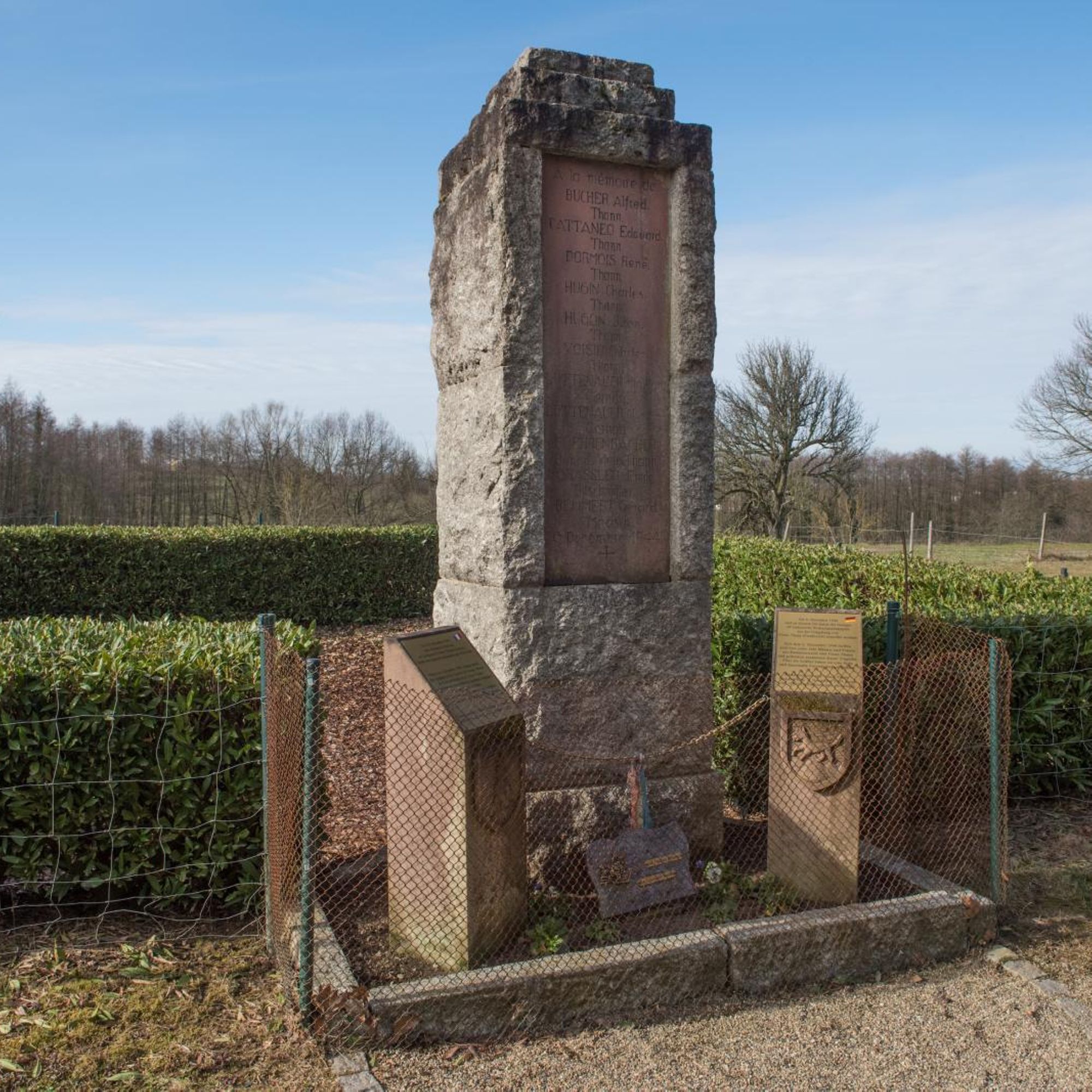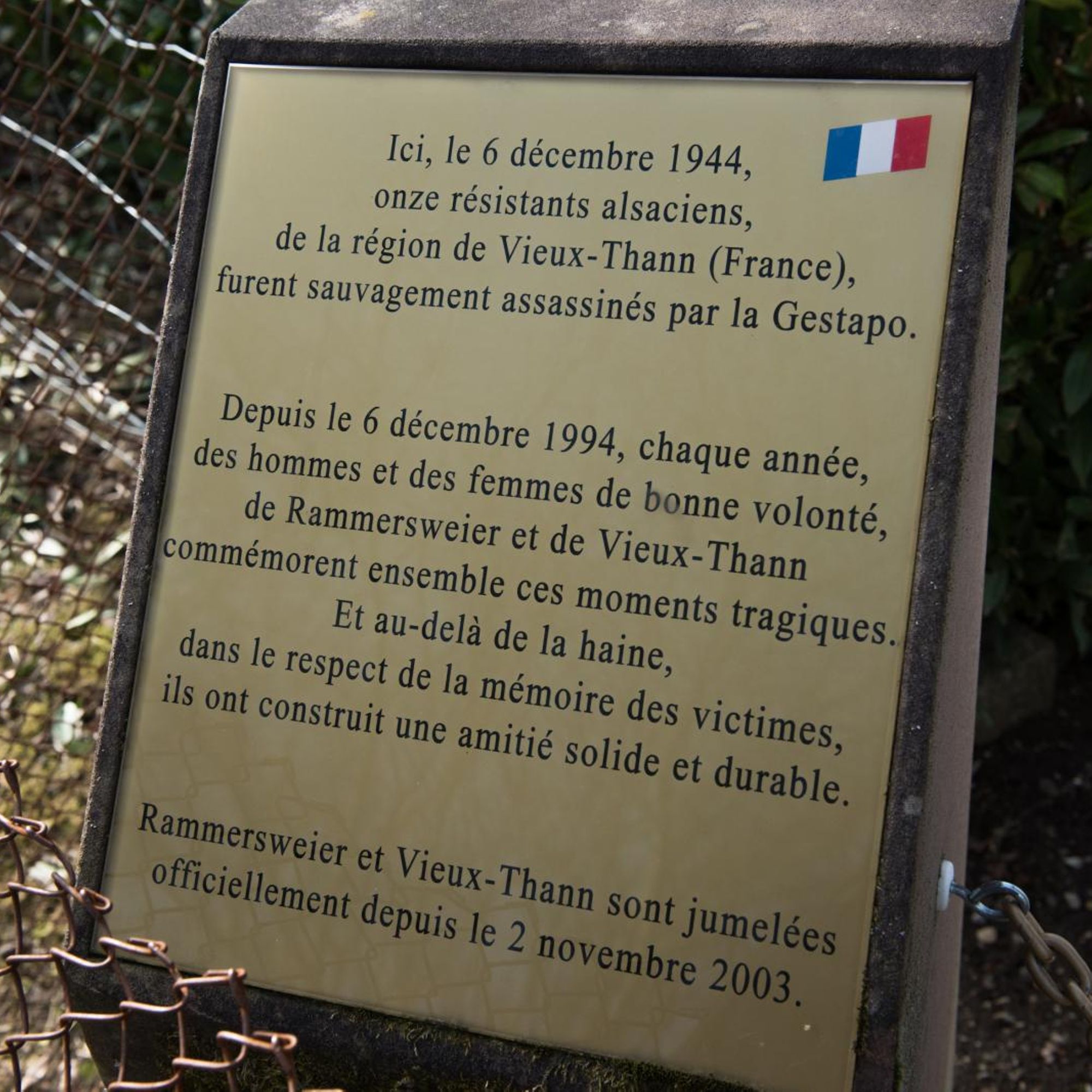 Ici, le 6 décembre 1944, onze résistants alsaciens, de la région de Vieux-Thann (France), furent sauvagement assassinés par la Gestapo