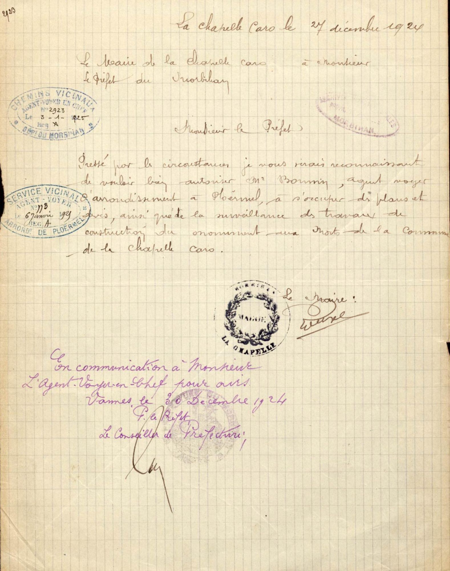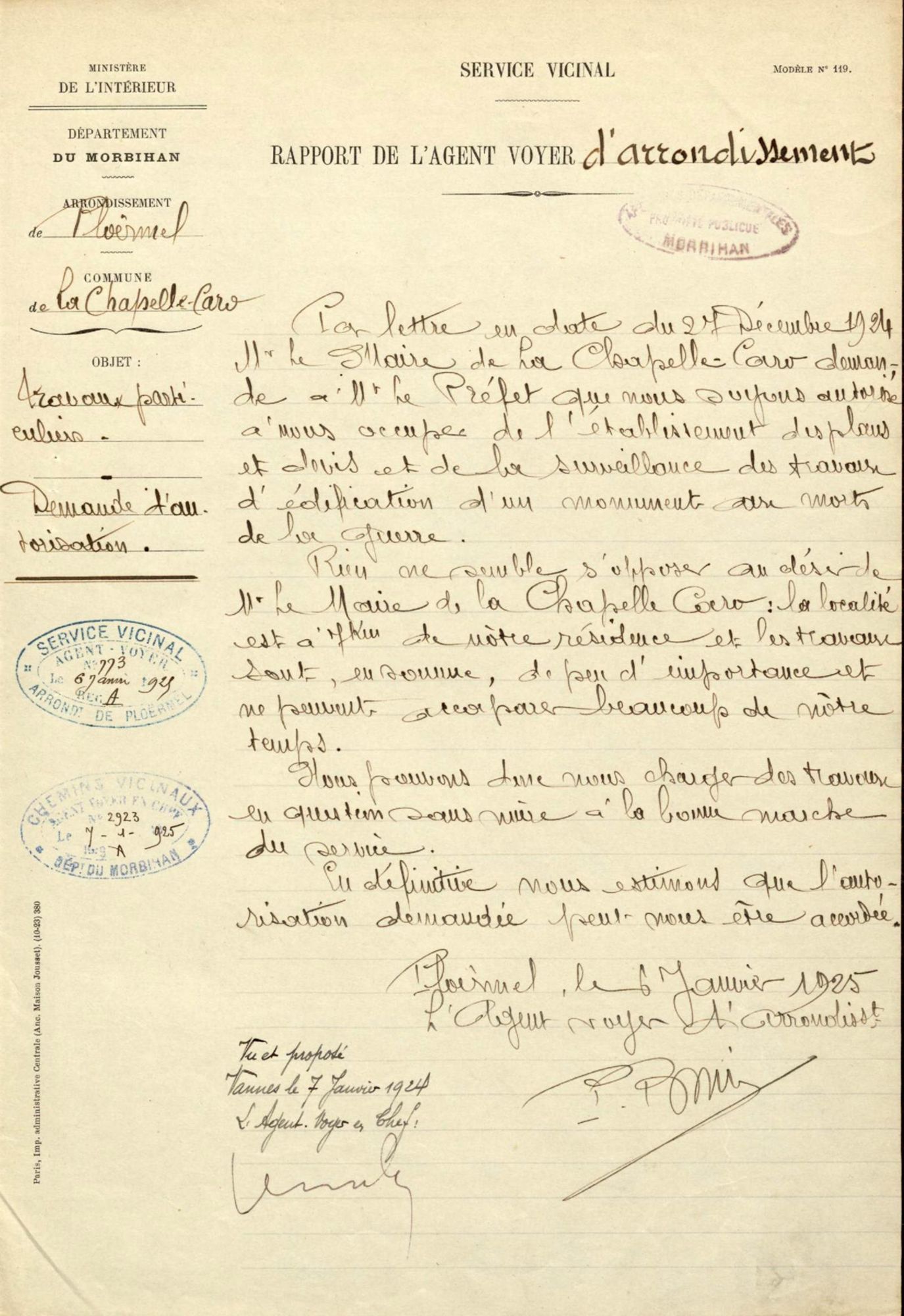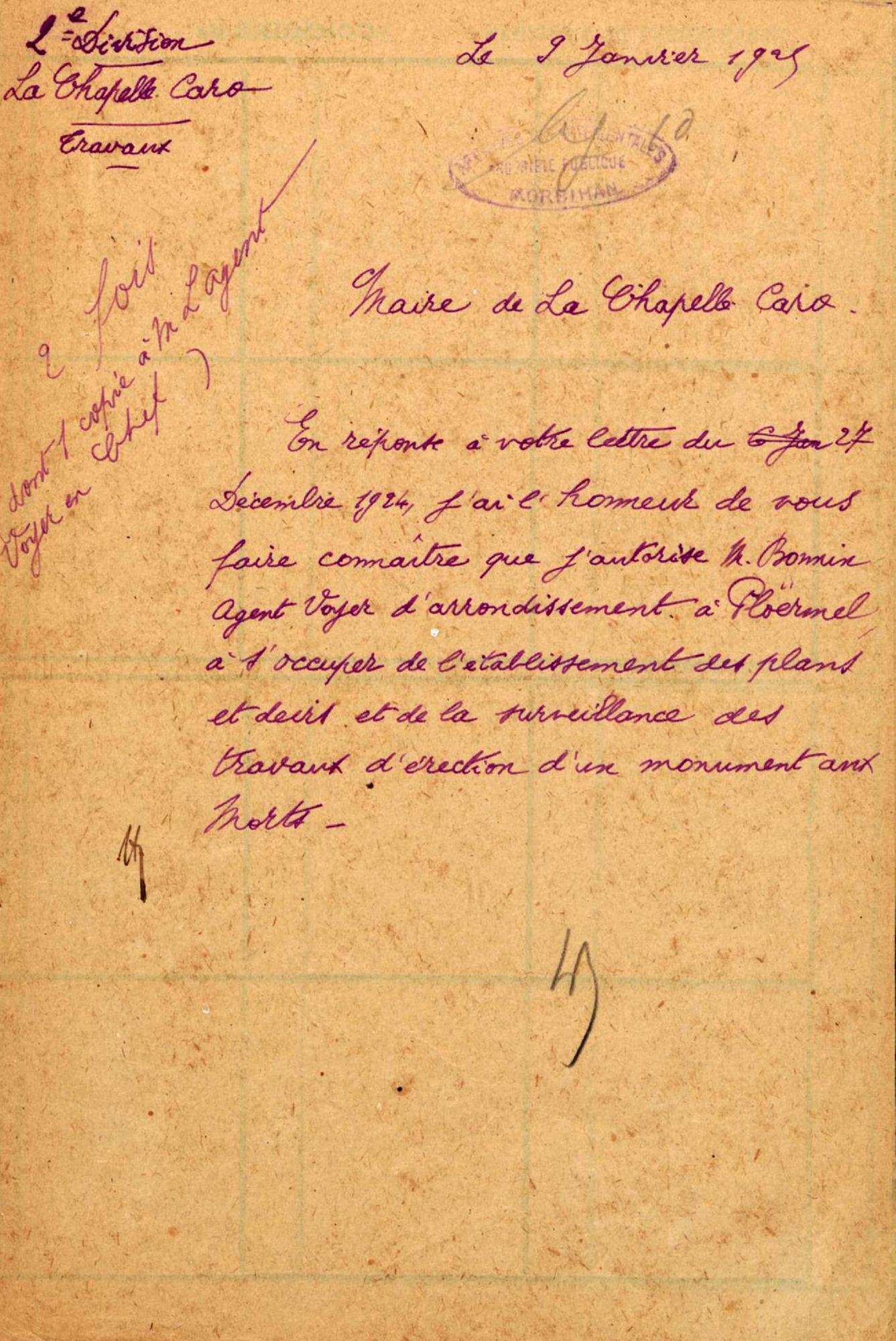 Demande autorisation que M. Bomin, agent voyer d'arrondissement à Ploërmel, s'occupe des plans et devis ainsi que de la surveillance des travaus de construction du monument