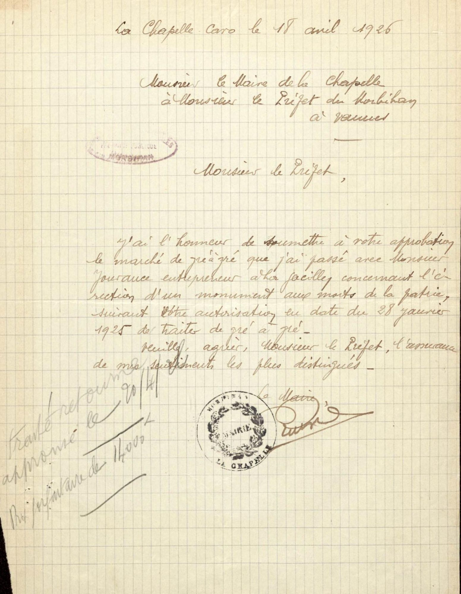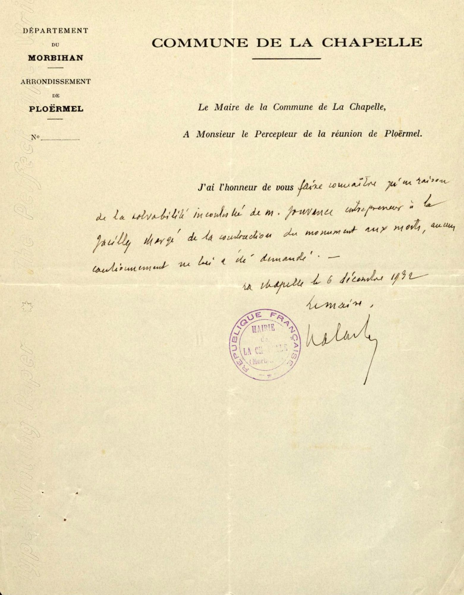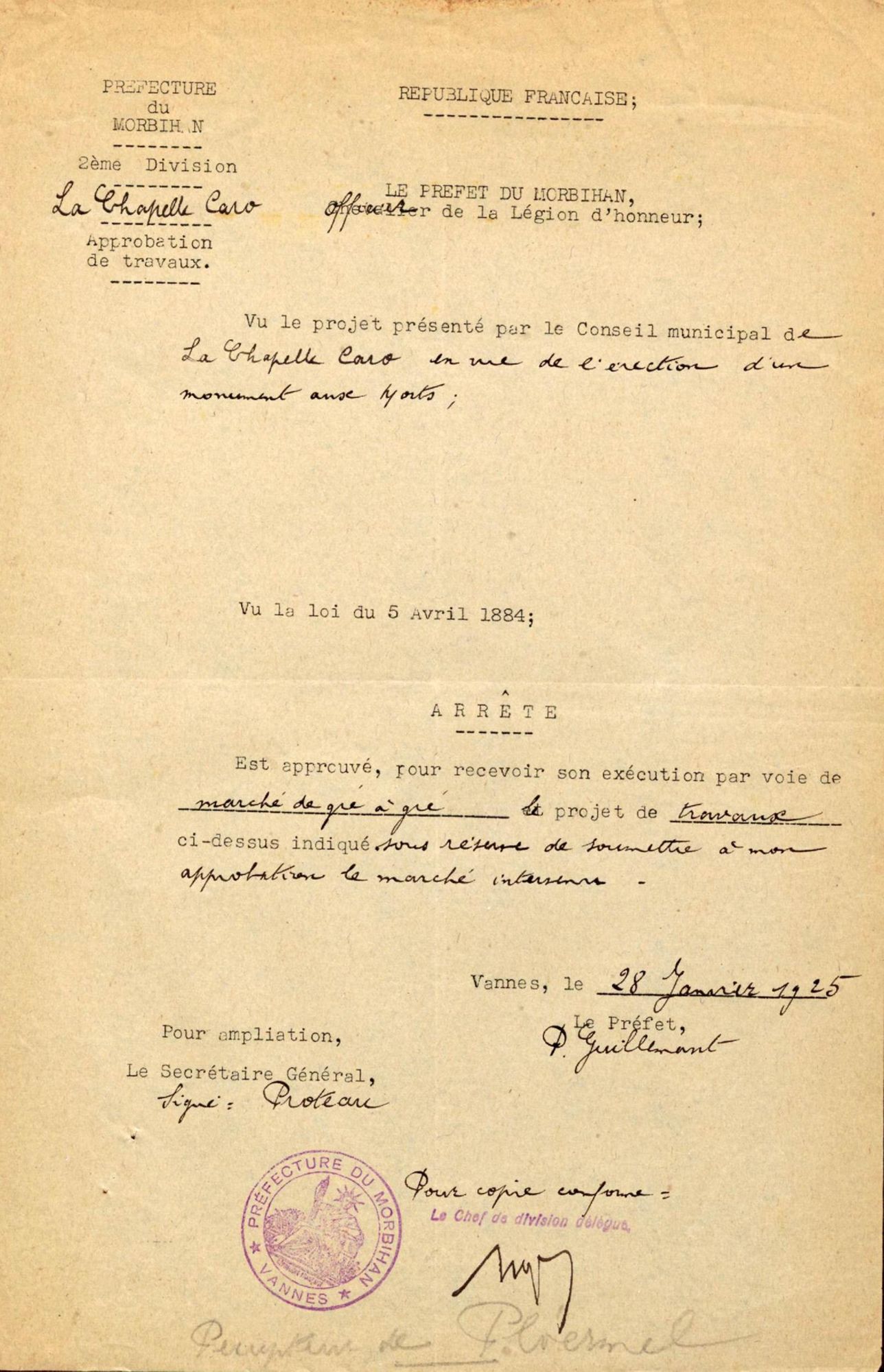 Demande autorisation que M. Bomin, agent voyer d'arrondissement à Ploërmel, s'occupe des plans et devis ainsi que de la surveillance des travaus de construction du monument