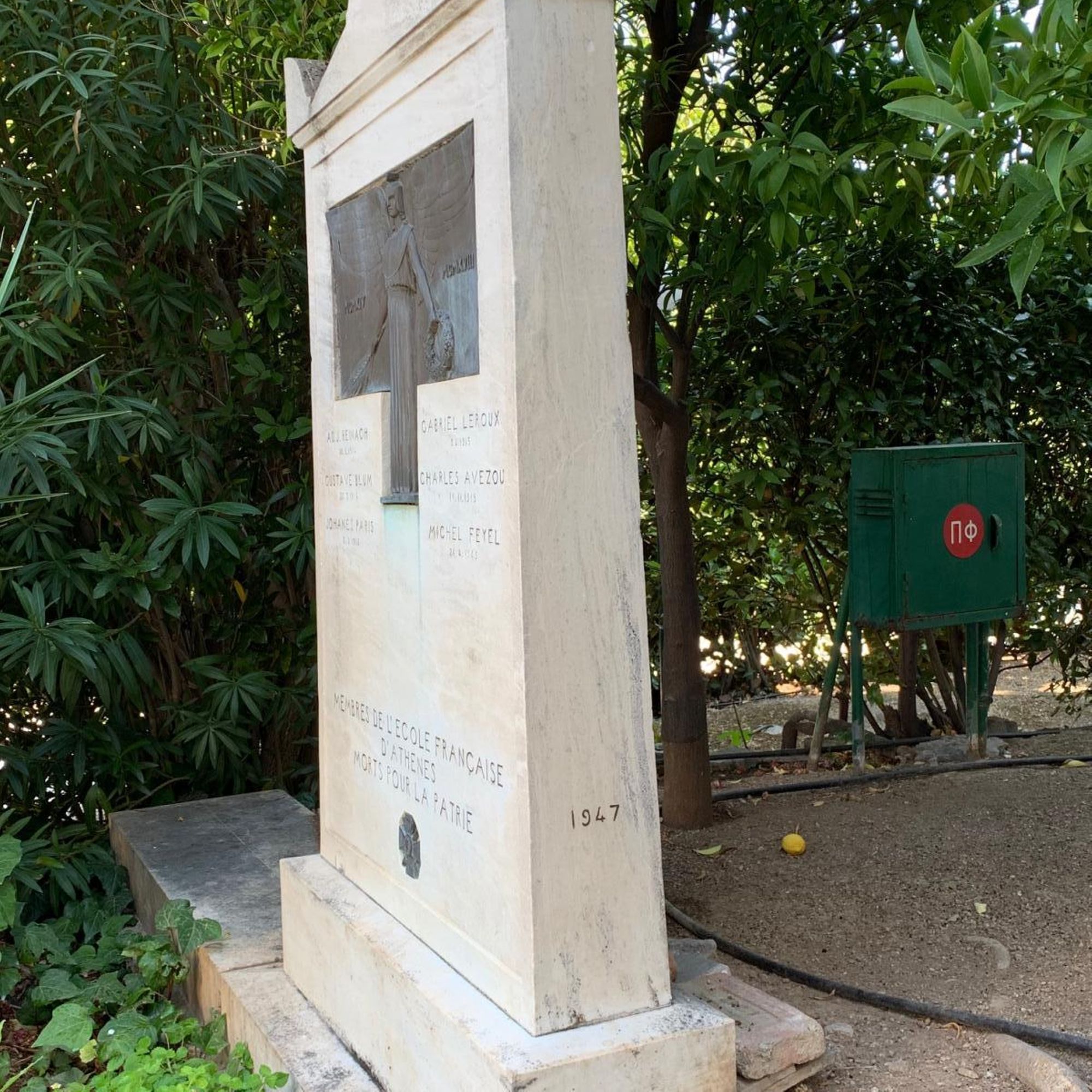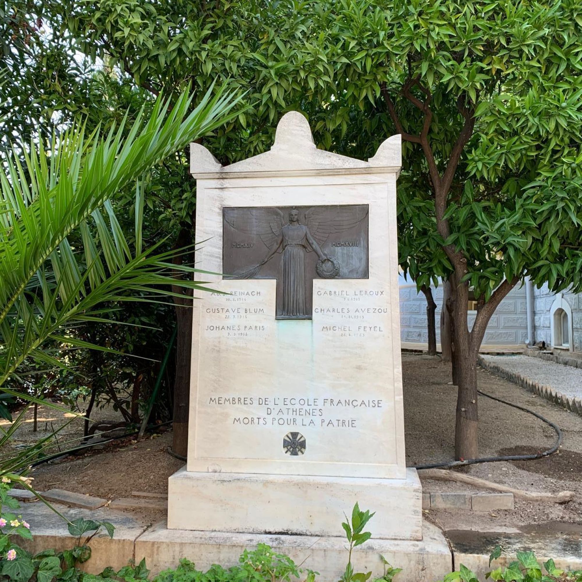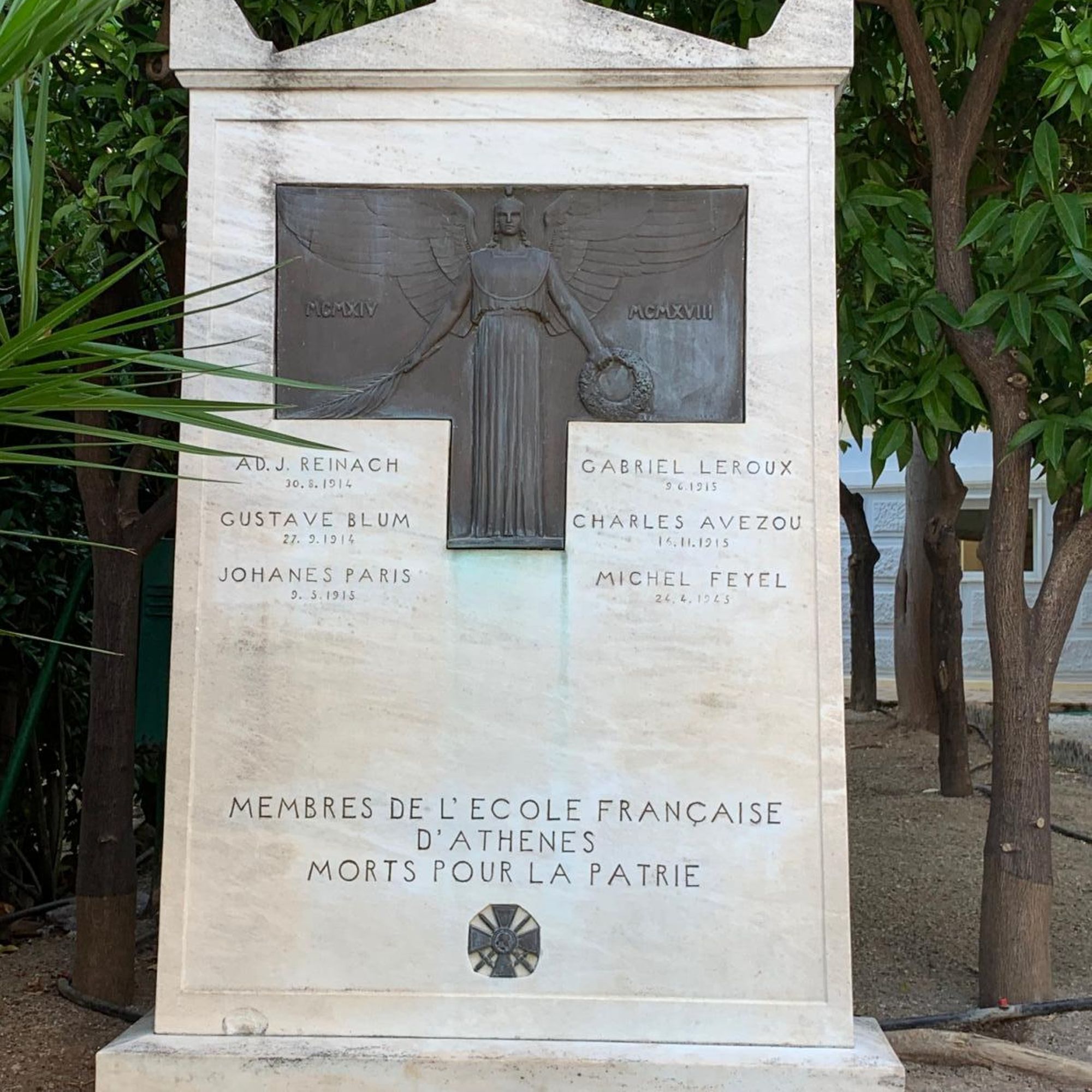 Le 31 mars 1921, Ch. Picard et Robert de Billy, ministre plénipotentiaire de France en Grèce, inaugurent dans les jardins de l'EFA, près de l'escalier menant au bâtiment central, la stèle commémorant les morts pour la France de l’École. Ils prononcent à cette occasion d'émouvants discours regroupés dans un fascicule, Hommage aux morts pour la patrie, que le service des archives met en ligne en ce 11 novembre. Ce fascicule se termine par une mention à la plaque posée, en 1921 également, dans l'entrée de l'actuelle maison des hôtes, à la mémoire du belge Jean de Mot, premier membre étranger de l'École (1900-1901), tué en octobre 1918 lors de l’une des dernières confrontations.