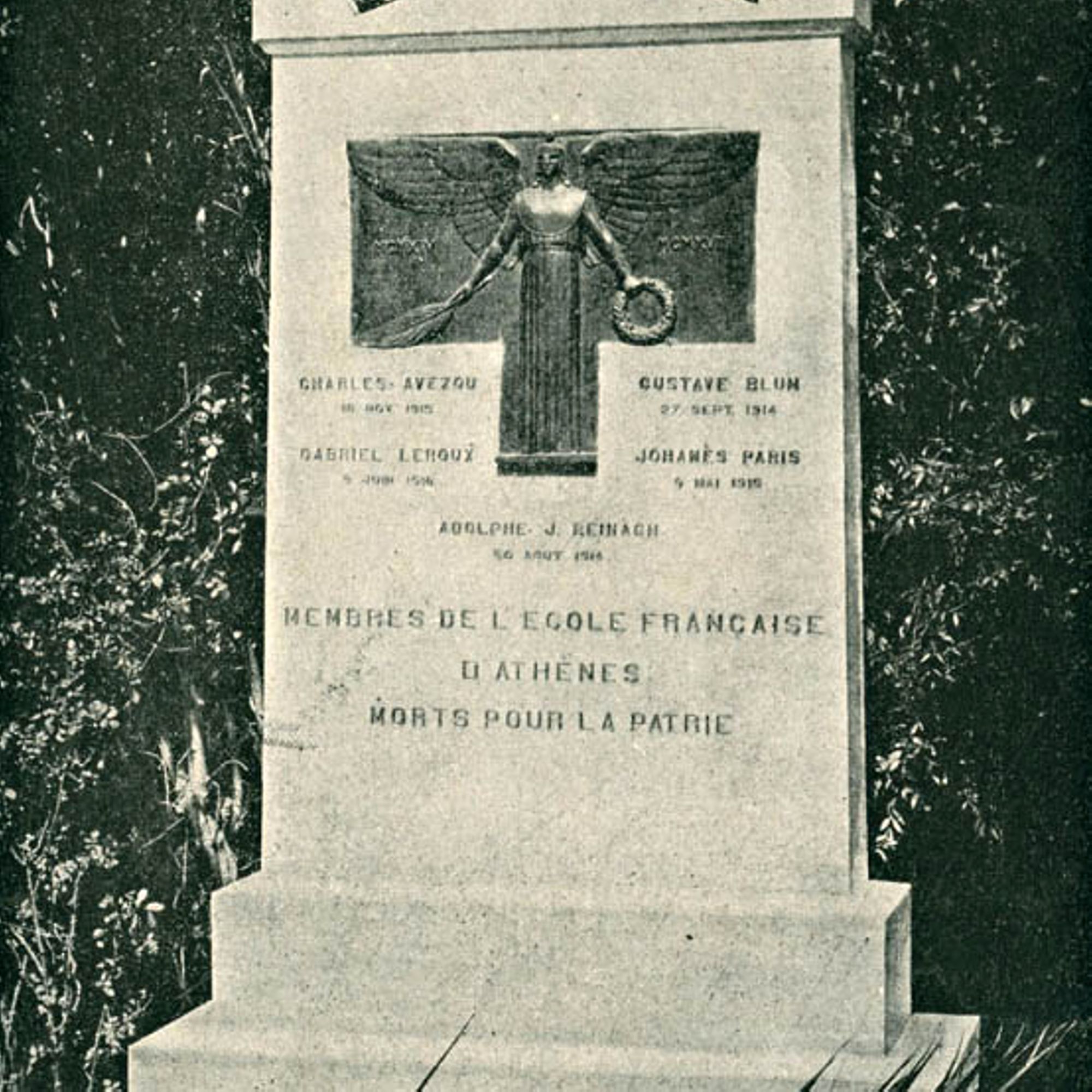 Dès 1915, le directeur de l’EFA, Gustave Fougères, ouvre le volume 39 du Bulletin de correspondance hellénique par un avant-propos intitulé « Nos deuils 1914-1915 ». Il y fait la nécrologie de Gabriel Leroux (promotion 1905) et de Charles Avezou (promotion 1910), deux des membres français de l’École morts au front en 1915. Il y ajoute un mot sur Johannès Pâris (promotion 1907), Adolphe-Joseph Reinach (promotion 1908) et Gustave Blum (promotion 1911), alors tous trois portés disparus et dont la perte est confirmée par la suite.