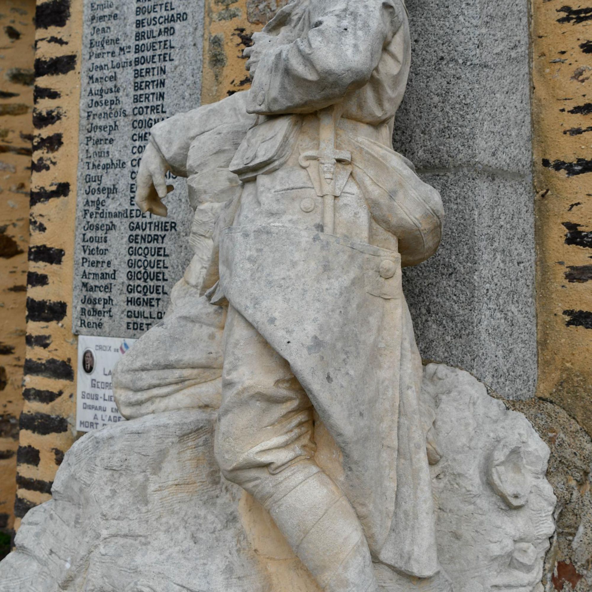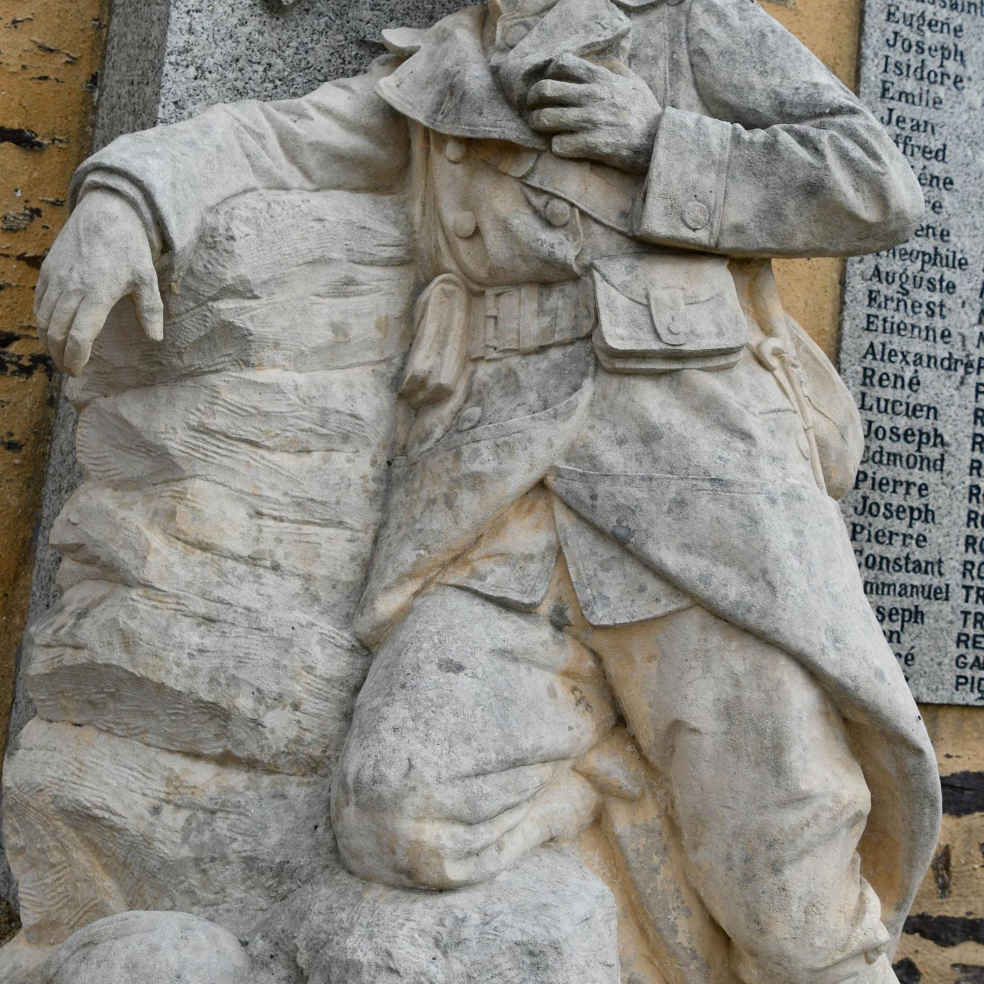 - Statue de poilu blessé agenouillé sur un rocher devant un obélisque sur socle