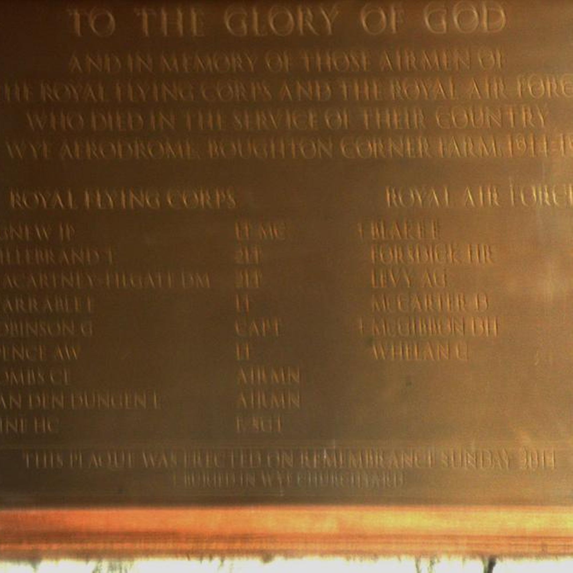 TO THE GLORY OF GOD AND IN MEMORY OF THOSE AIRMEN OF THE ROYAL FLYING CORPS AND THE ROYAL AIR FORCE WHO DIED IN SERVICE OF THEIR COUNTRY AT WYE AERODROME BROUGHTON CORNER FARM 1914-1918