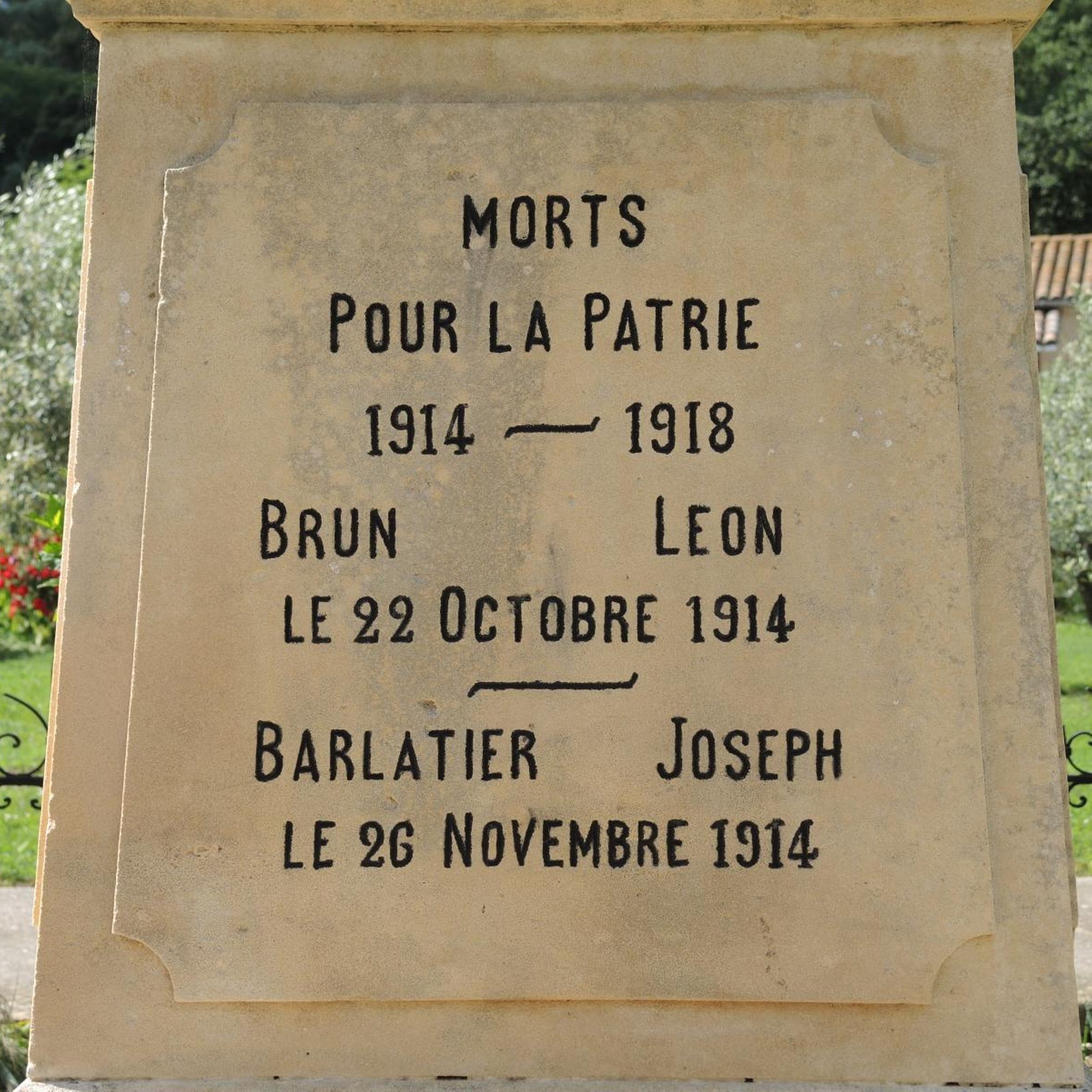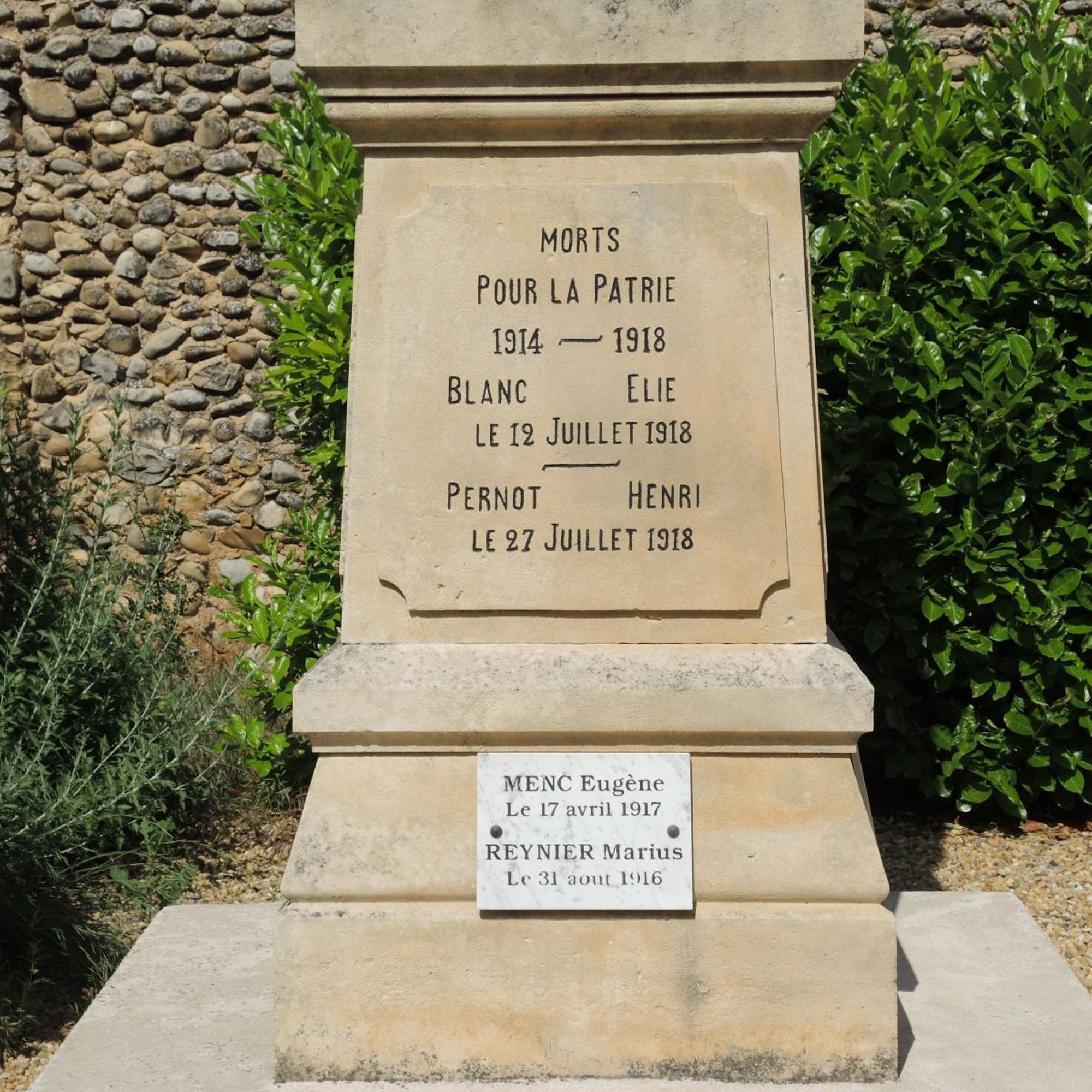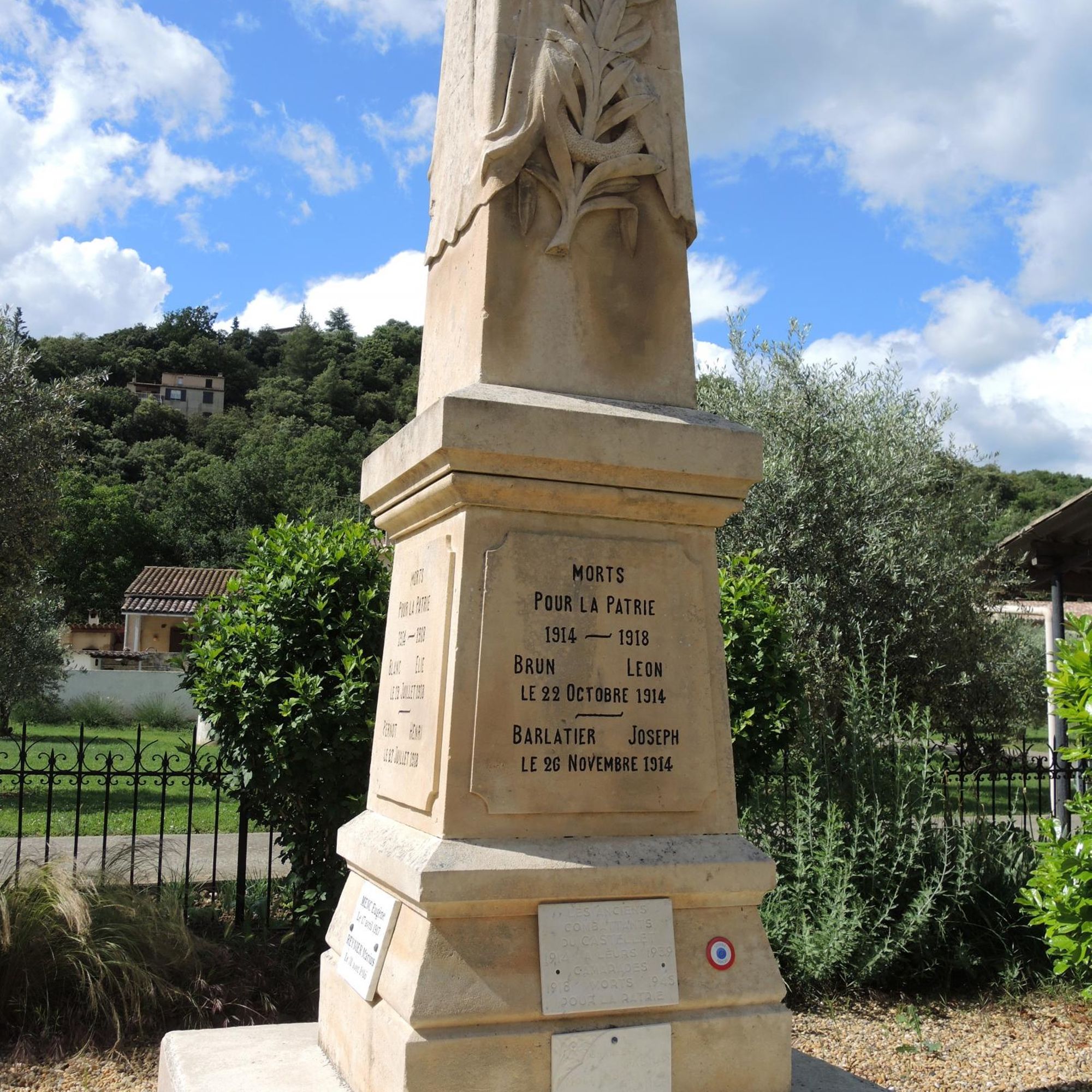 - Obélisque sur un socle élevé, entouré d'une grille ; décor en bas-relief sur la partie sommitale ; inscriptions (noms des morts) sur les quatre faces du socle ; trois plaques de marbres ajoutés sur le monument