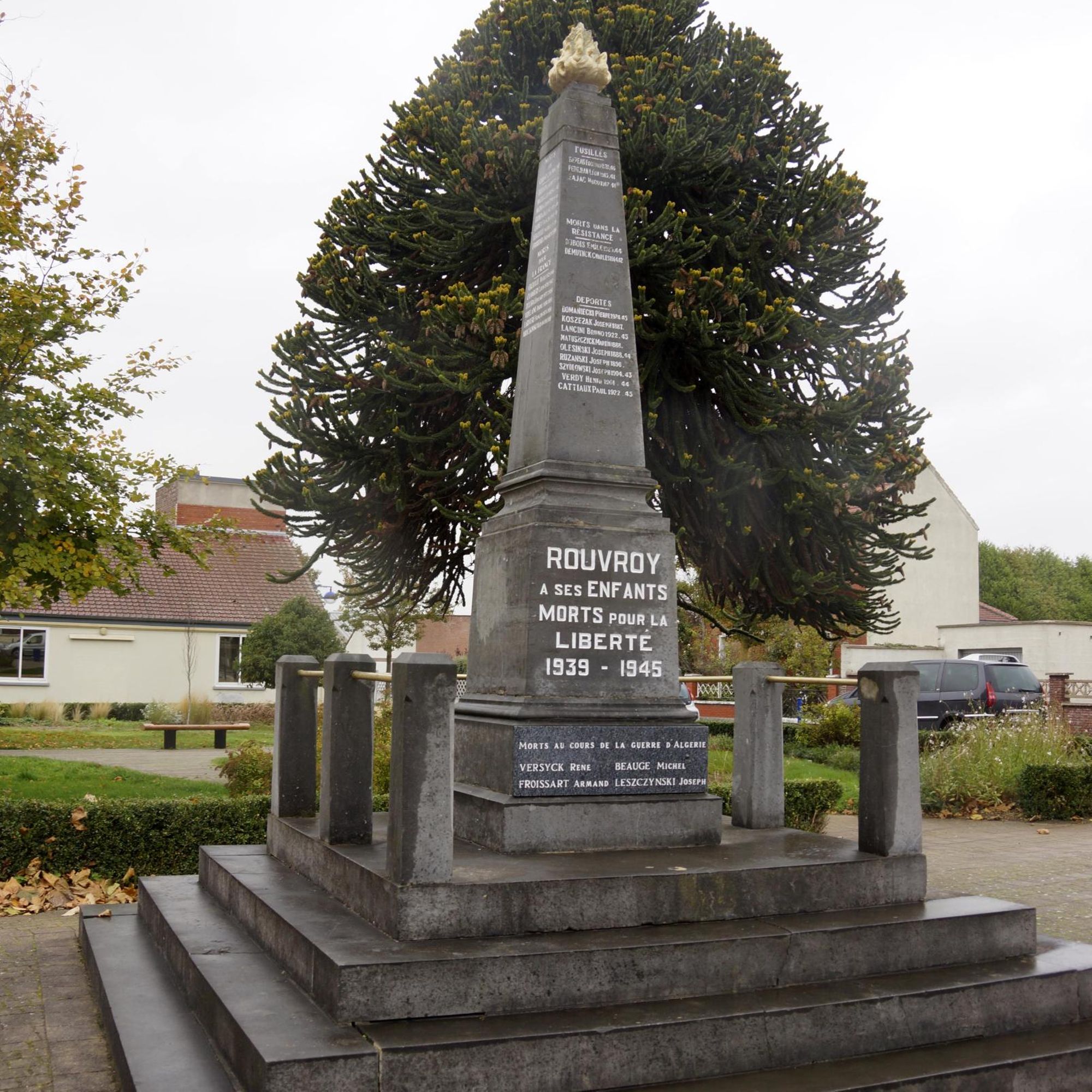 en présence de Monsieur L. CASANOVA, ministre des anciens combattants et victimes de guerre, Monsieur A. LECOEUR, Sous-secrétaire d'Etat au ministère de la production industrielle, Monsieur A. PIDOUX, maire de Rouvroy, Colonel DASSONVILLE, représentant la Résistance.