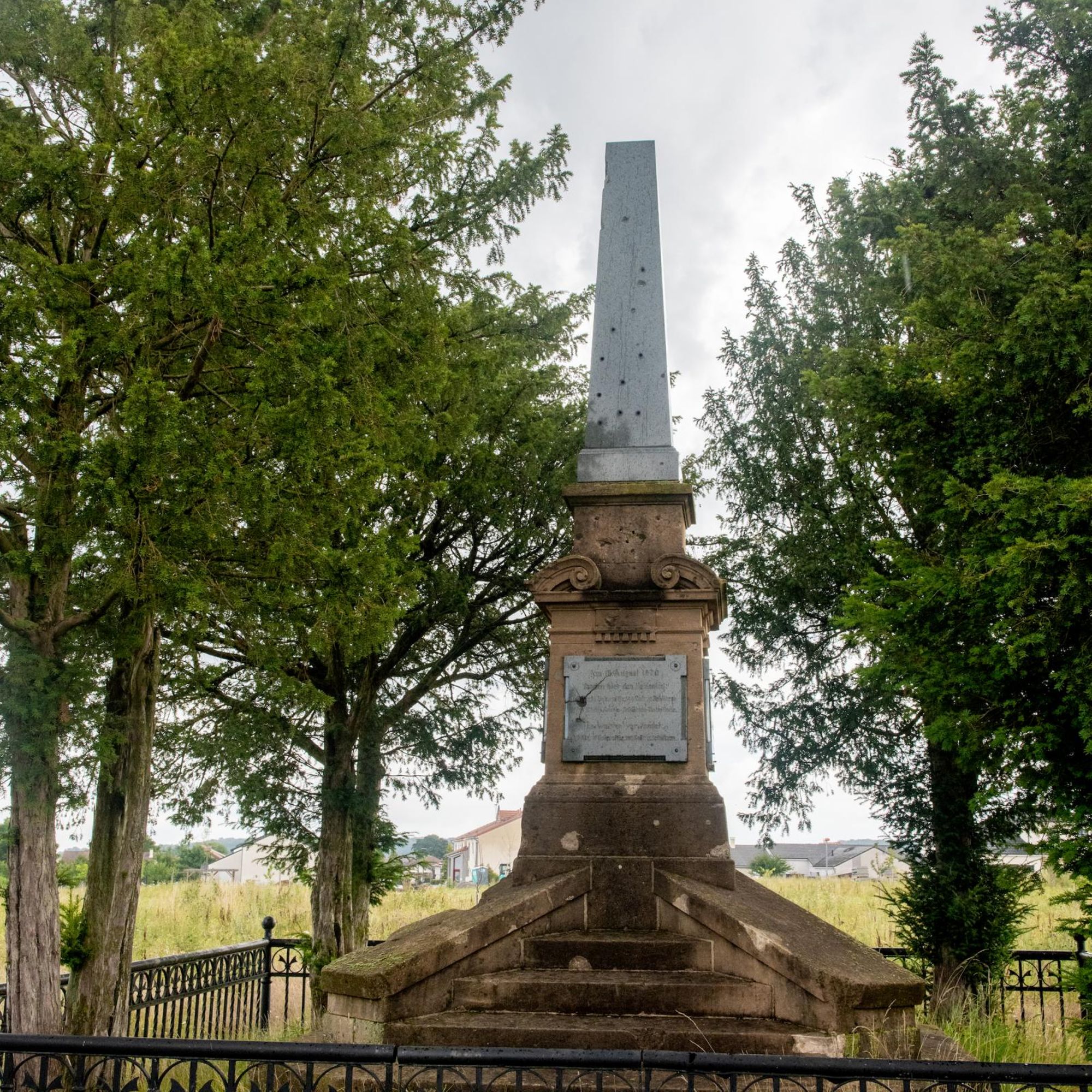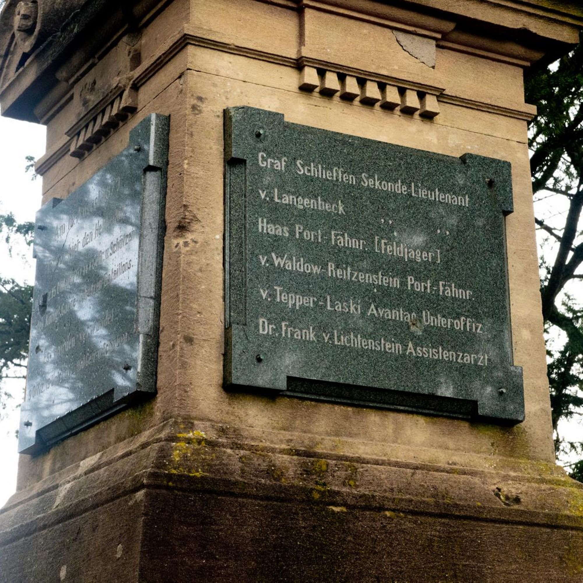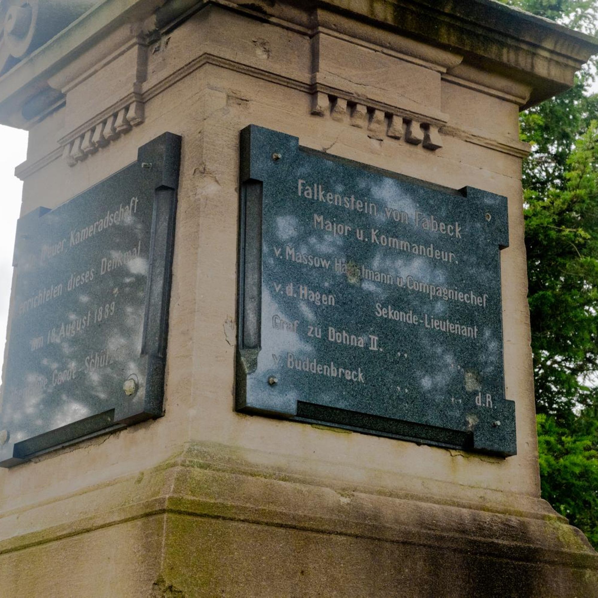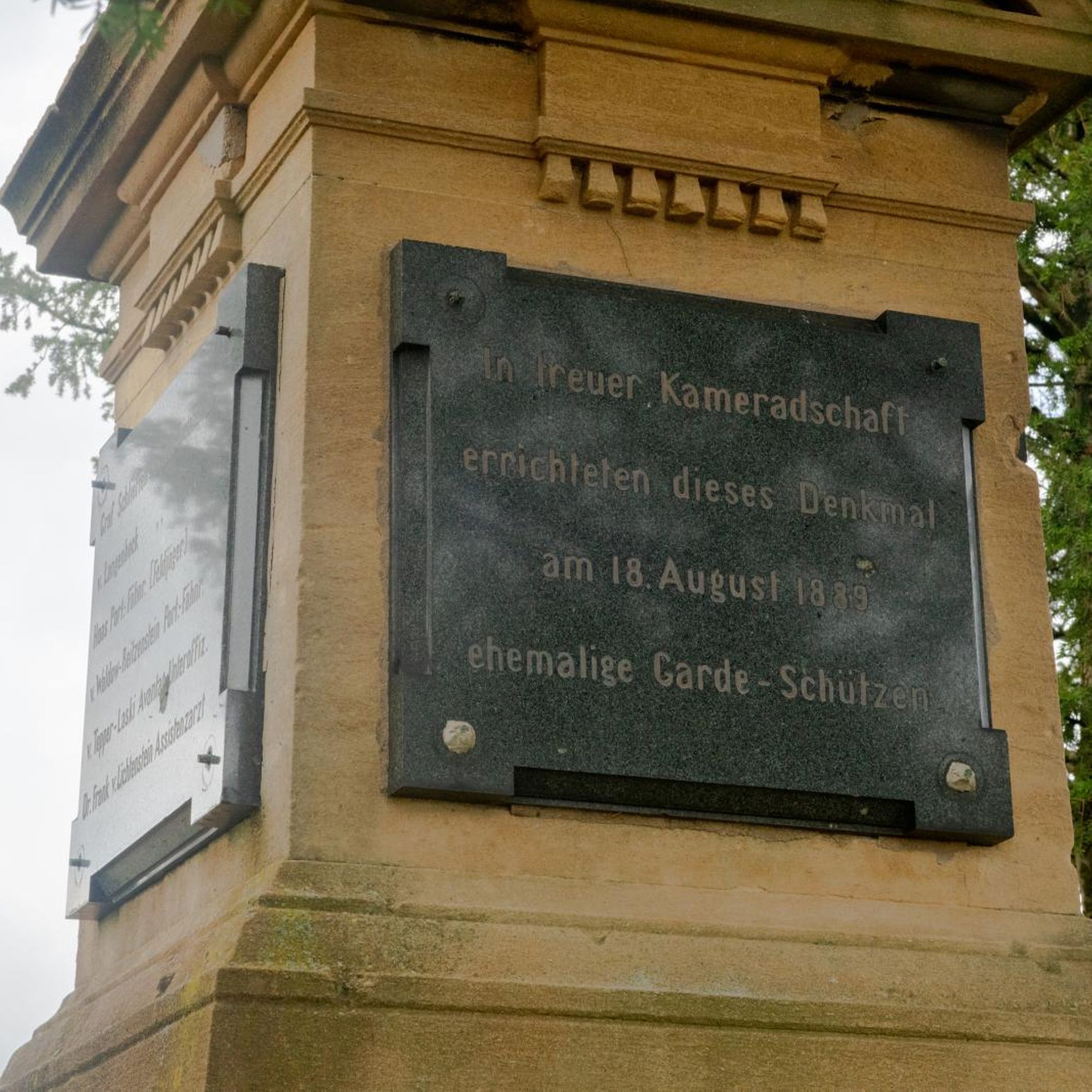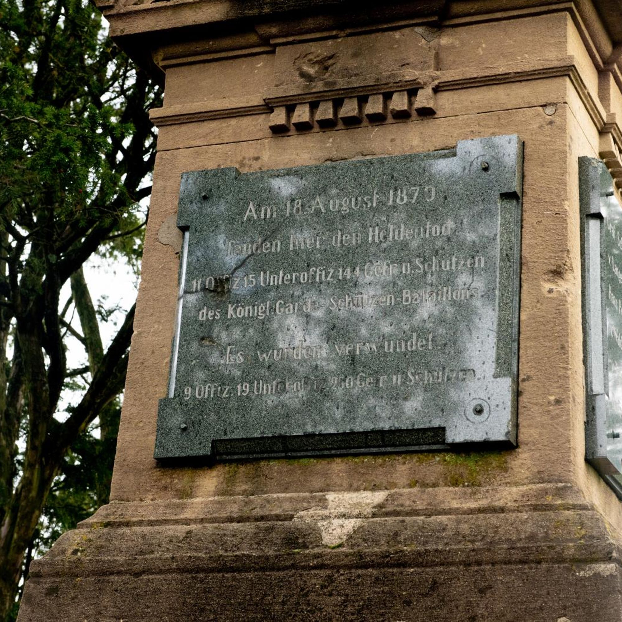- Le monument du "bataillon de Schützen" de la Garde royale prussienne a été installé au bord d'un petit chemin au sud-ouest d'Amanvillers, non loin de la route qui mène à Vernéville. L'unité s'est distinguée le 18 août 1870 lors de l'attaque contre le IVe Corps français qui était établi à Amanvillers. De façon originale, les noms de tous les morts du bataillon étaient inscrits sur les contreforts inclinés qui se trouvent de chaque côté du monument, mais le temps et l'érosion les ont cependant gravement effacé... ne subsistent que les plaques de marbre fixées sur la partie haute - Inscriptions en allemand : "Am 18 august 1870 fanden hier den heldentod 11 offizieren, 15 unteroffizieren und 144 gefr.und schützen des königl. Garde Schützen Bataillons. Es wurden werwundet 9 offizieren, 19 unteroffizieren, 250 gefr. und schützen" - Les noms des 11 officiers tombés glorieusement sont inscrits sur ces plaques, de même que la date d'édification du monument "18 August 1889"