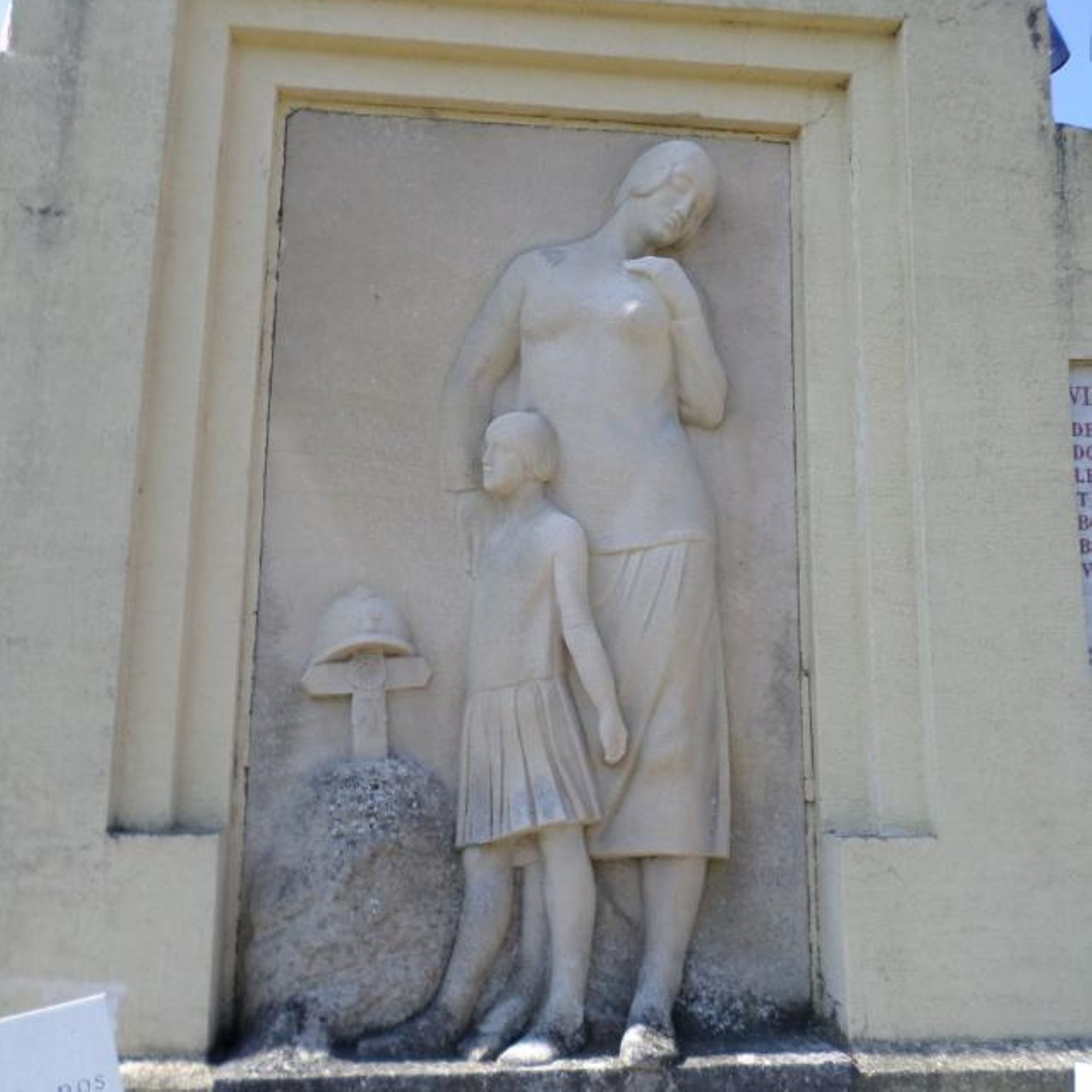Une veuve et sa fille devant la tombe d'un soldat en tenue très années 30