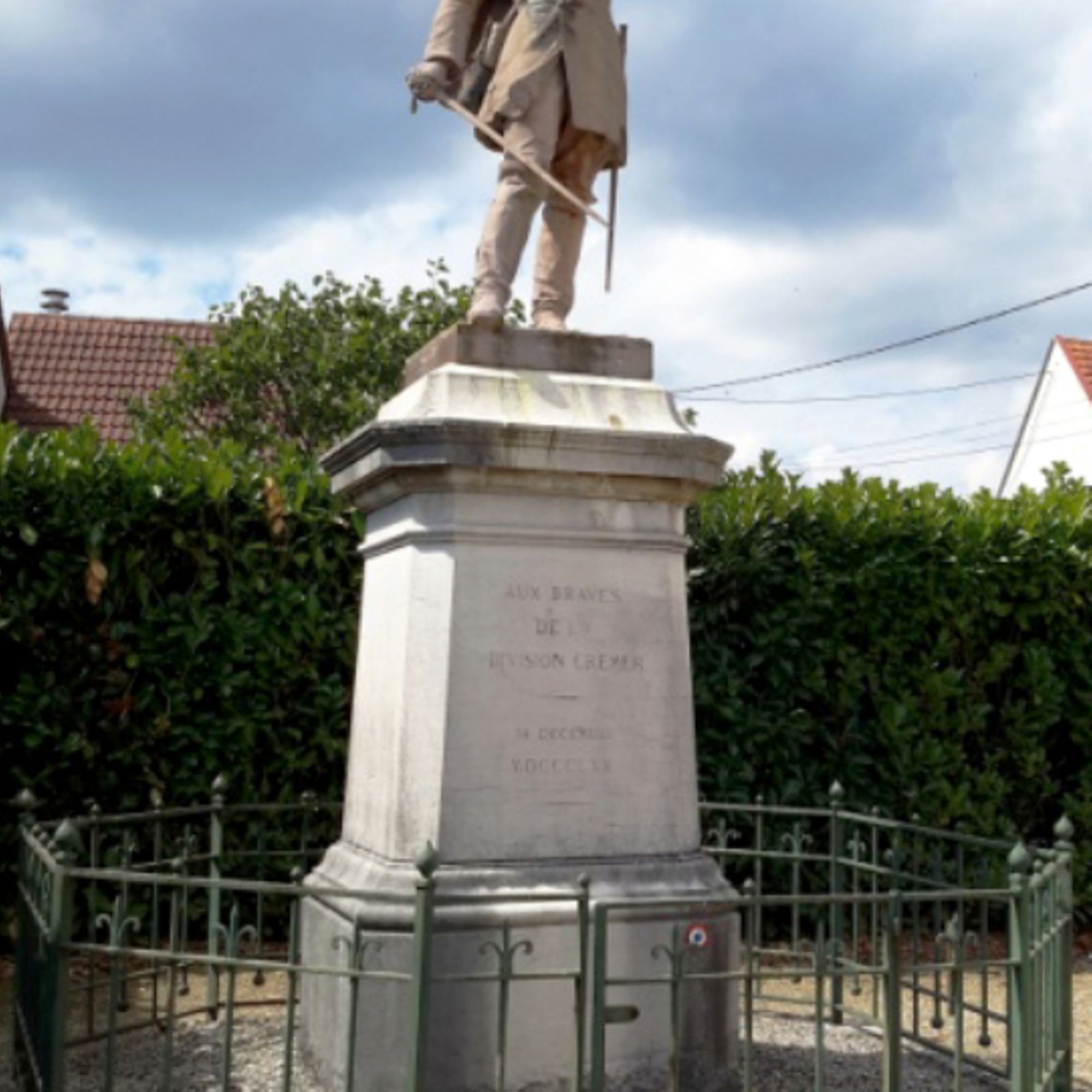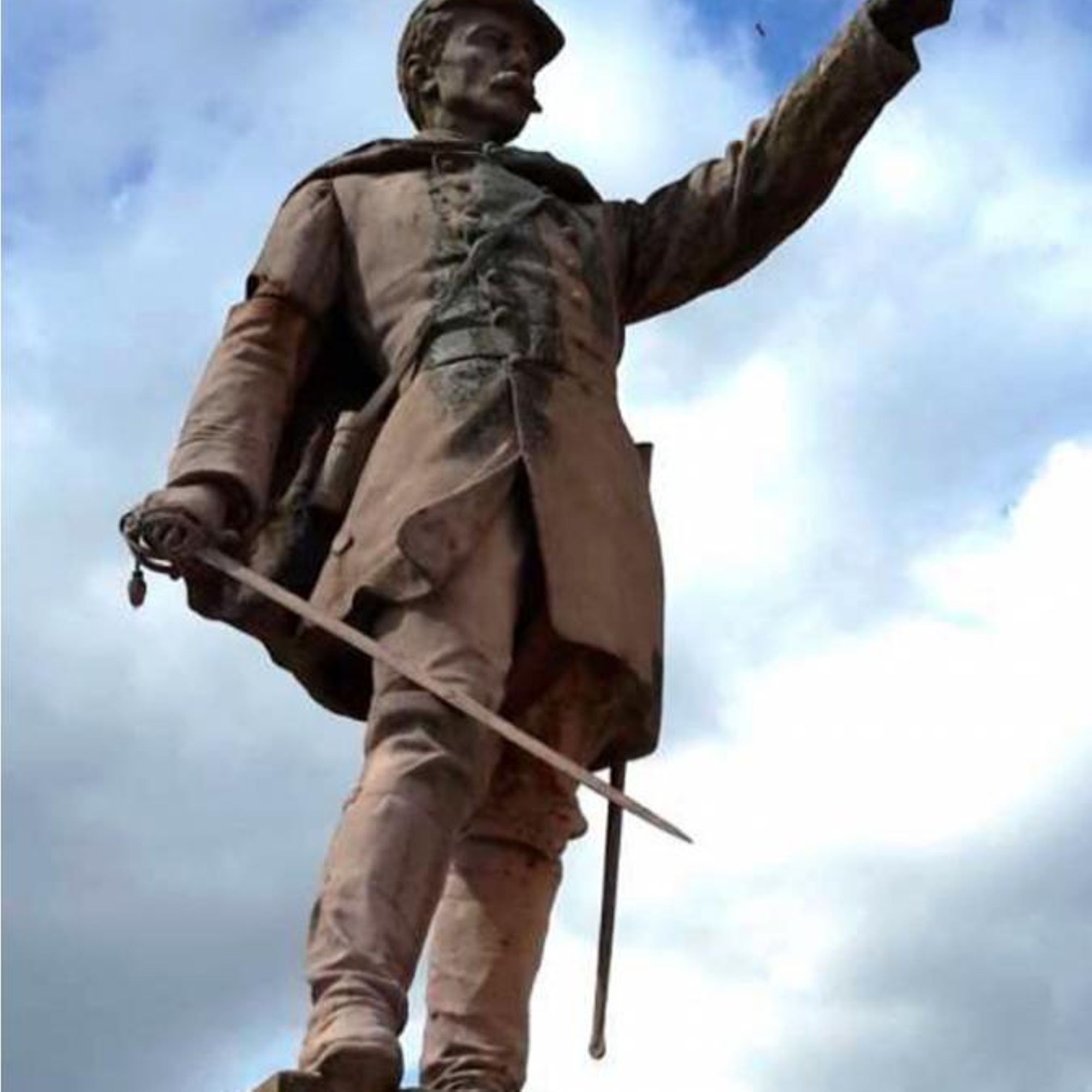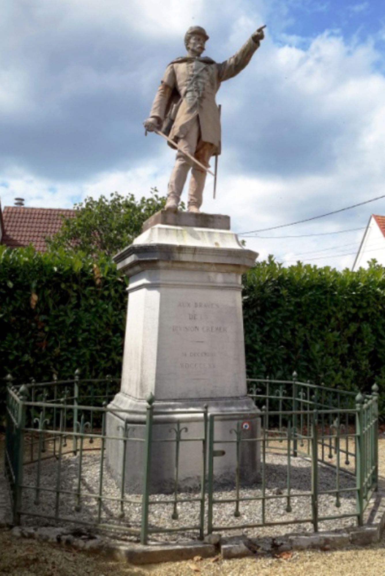 - Sur un piédestal se dresse un officier, l’épée a la main, montrant l’ennemi.