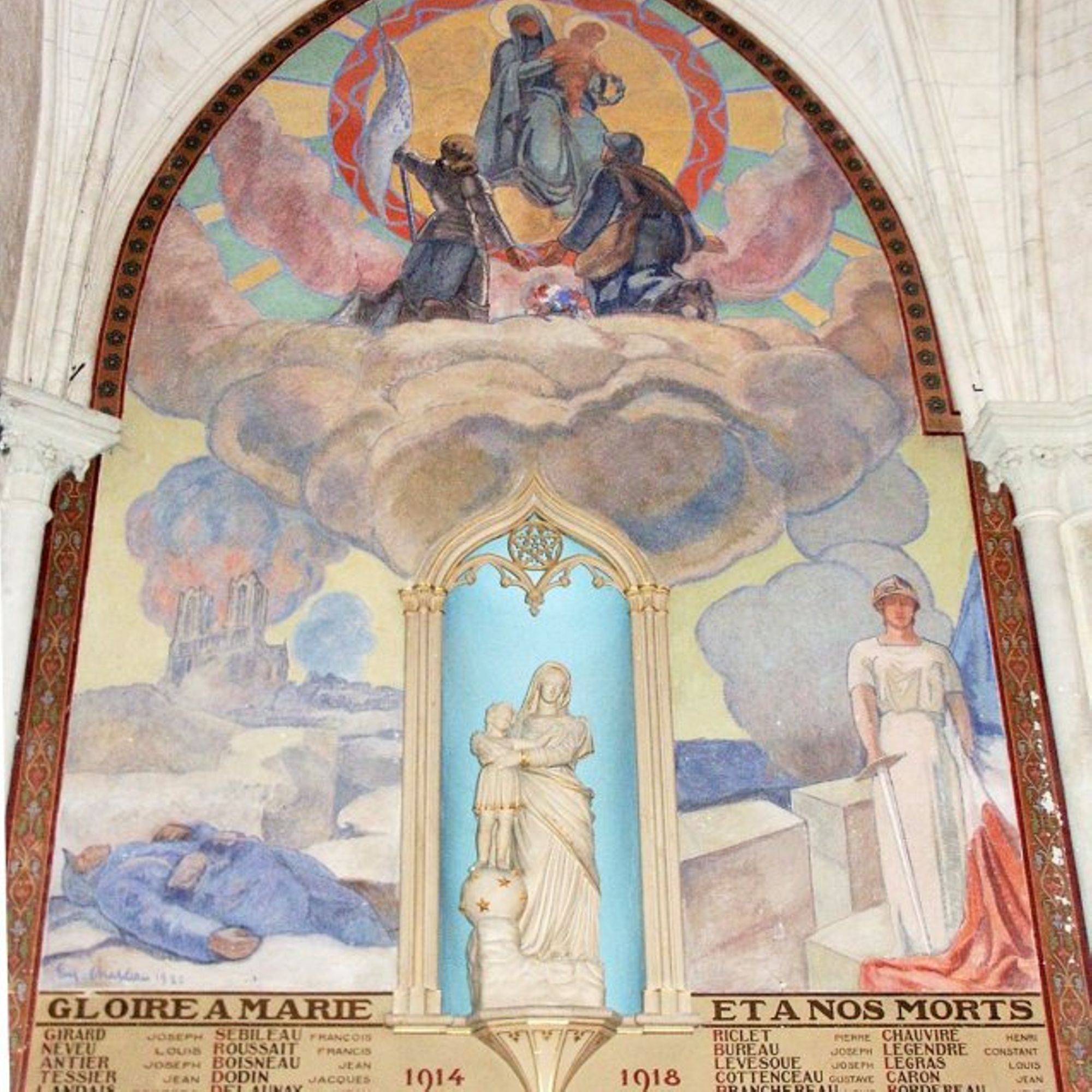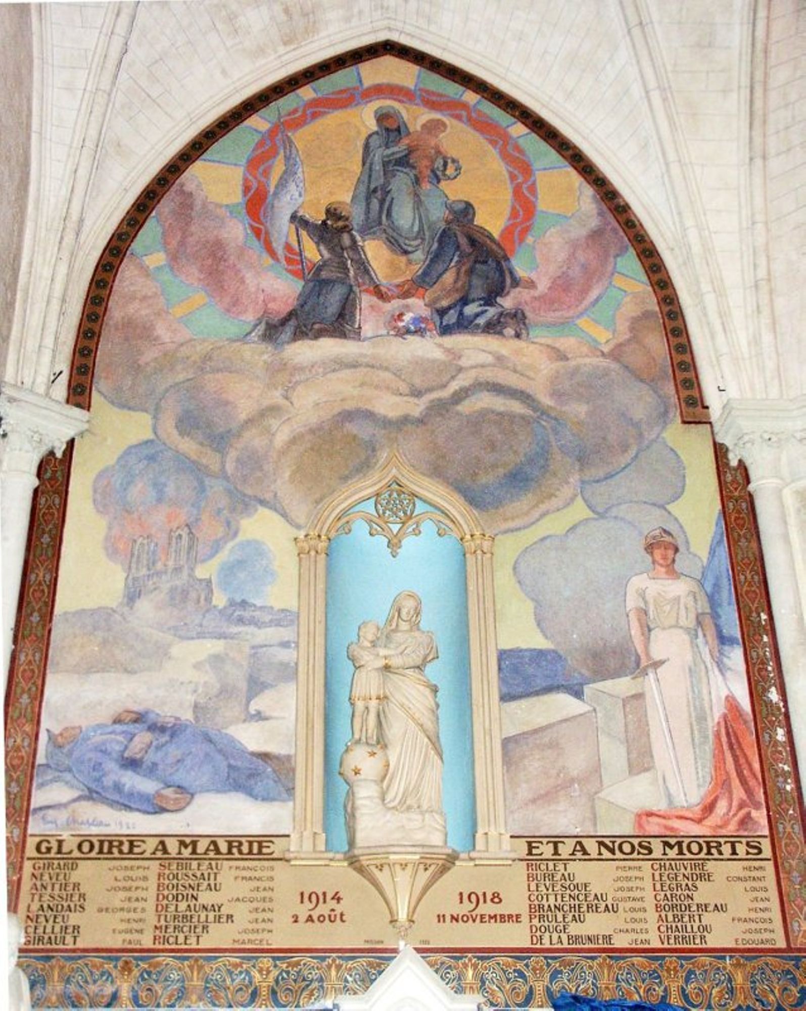 Dans la partie basse, de part et d'autre d'une niche sculptée abritant la Vierge et l'Enfant Jésus, on trouve à droite la Victoire, présentée debout devant un parapet crénelé - vêtue de blanc, la tête casquée, elle tient d'une main une épée pointée vers le sol et de l'autre le drapeau qui tombe à ses pieds. Sur la gauche, un soldat est étendu sur le sol. Derrière lui se dresse dans le ciel des colonnes de fumées qui sortent des tours bombardées de la cathédrale de Reims.