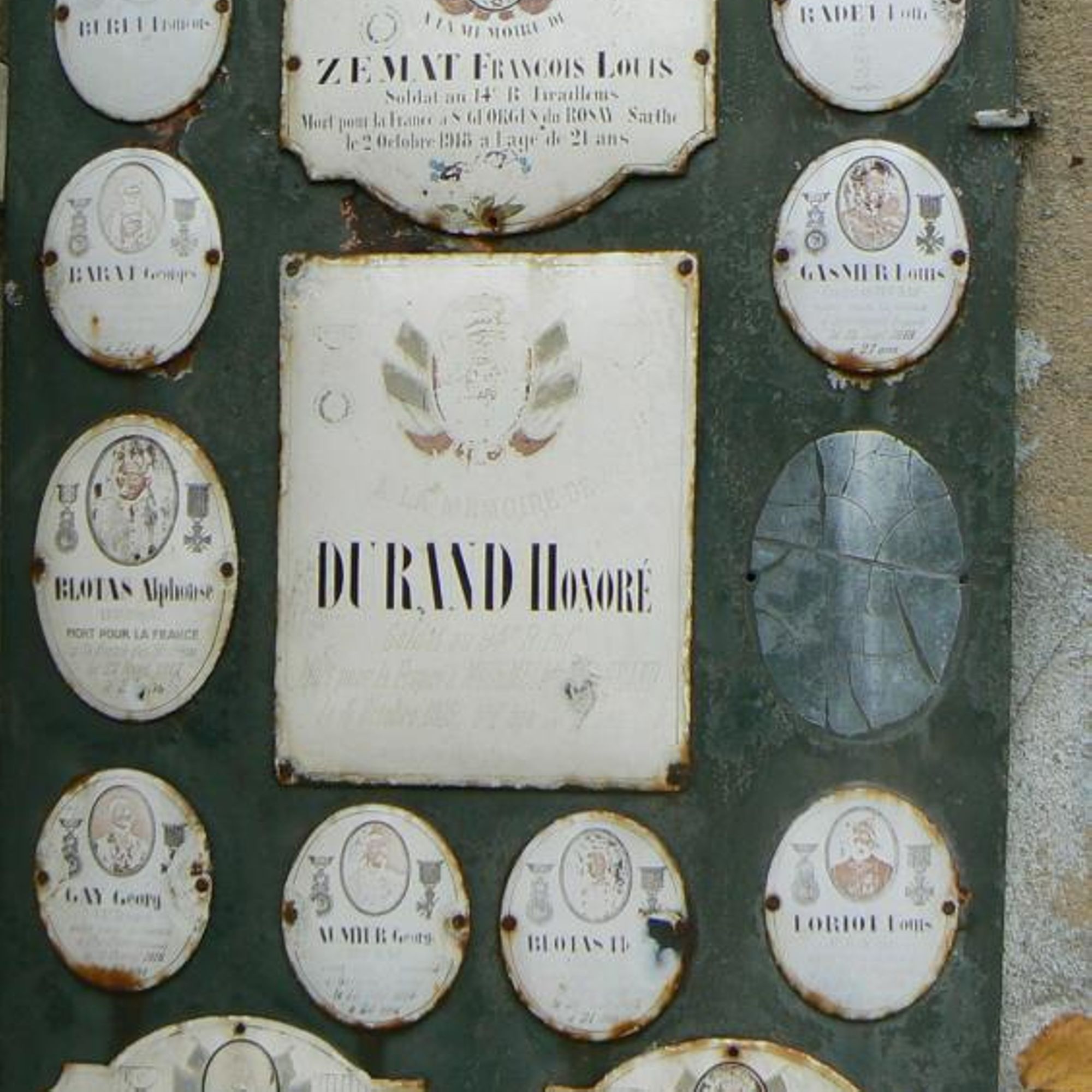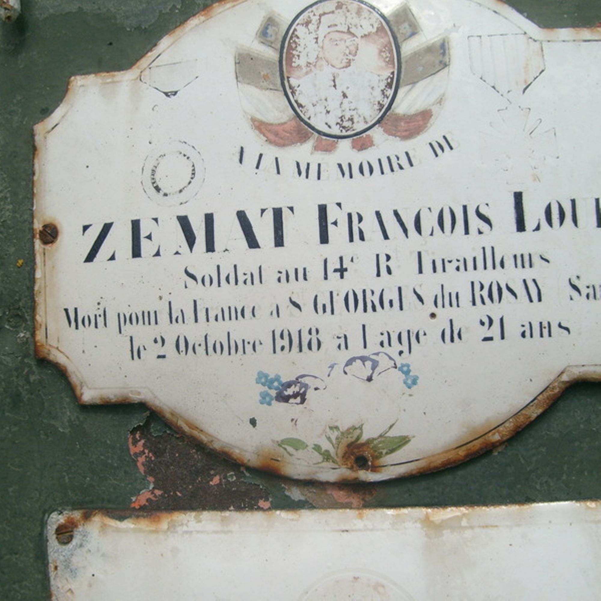 François ZEMAT [Plaque émaillée François Louis Soldat au 14e R. Tirailleurs Mort pour la France à St-Georges du Rosny Sarthe le 2 octobre 1918 à l'âge de 21 ans]