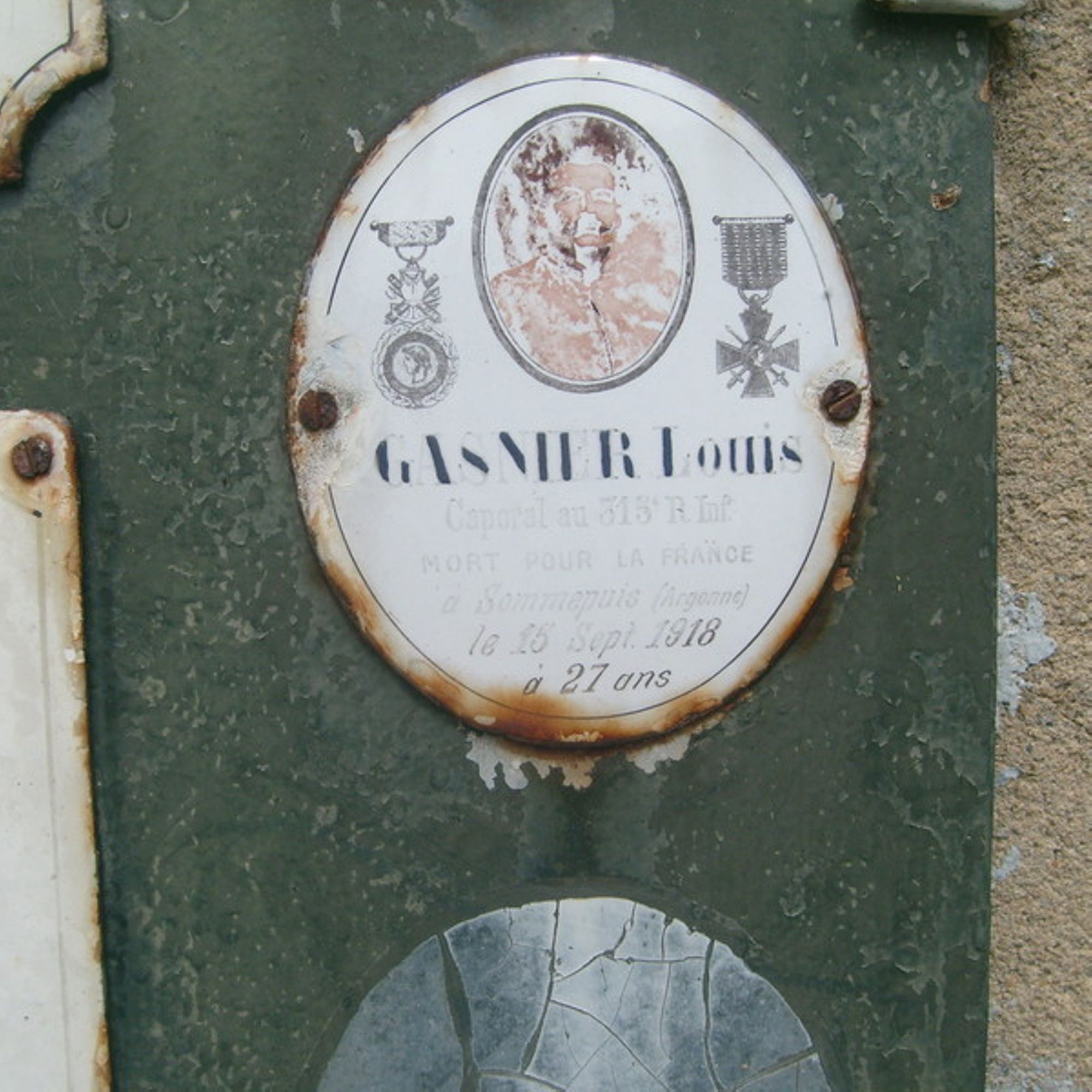 [Plaque émaillée GASNIER Louis Caporal au 315e R. Inf. Mort pour la France à Sommepuis (Argonne) le 15 sept. 1918 à 27 ans]