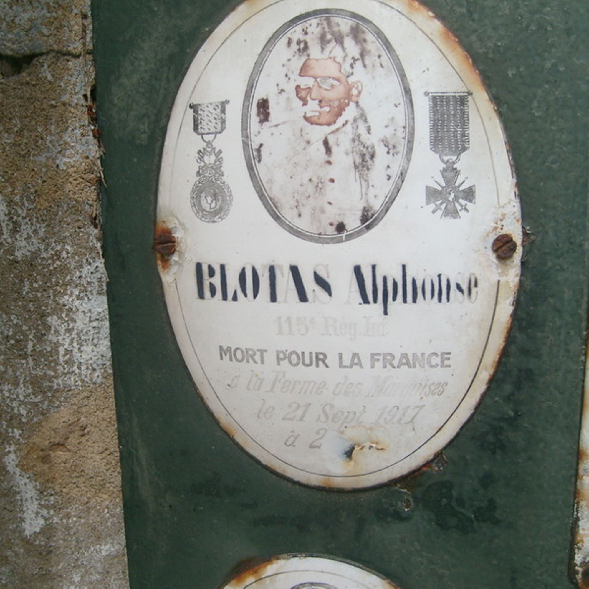 Alphonse BLOTAS [Plaque émaillée 115e Reg. Inf. Mort pour la France à la Ferme des Marroises le 21 sept. 1917 à 21 ans]