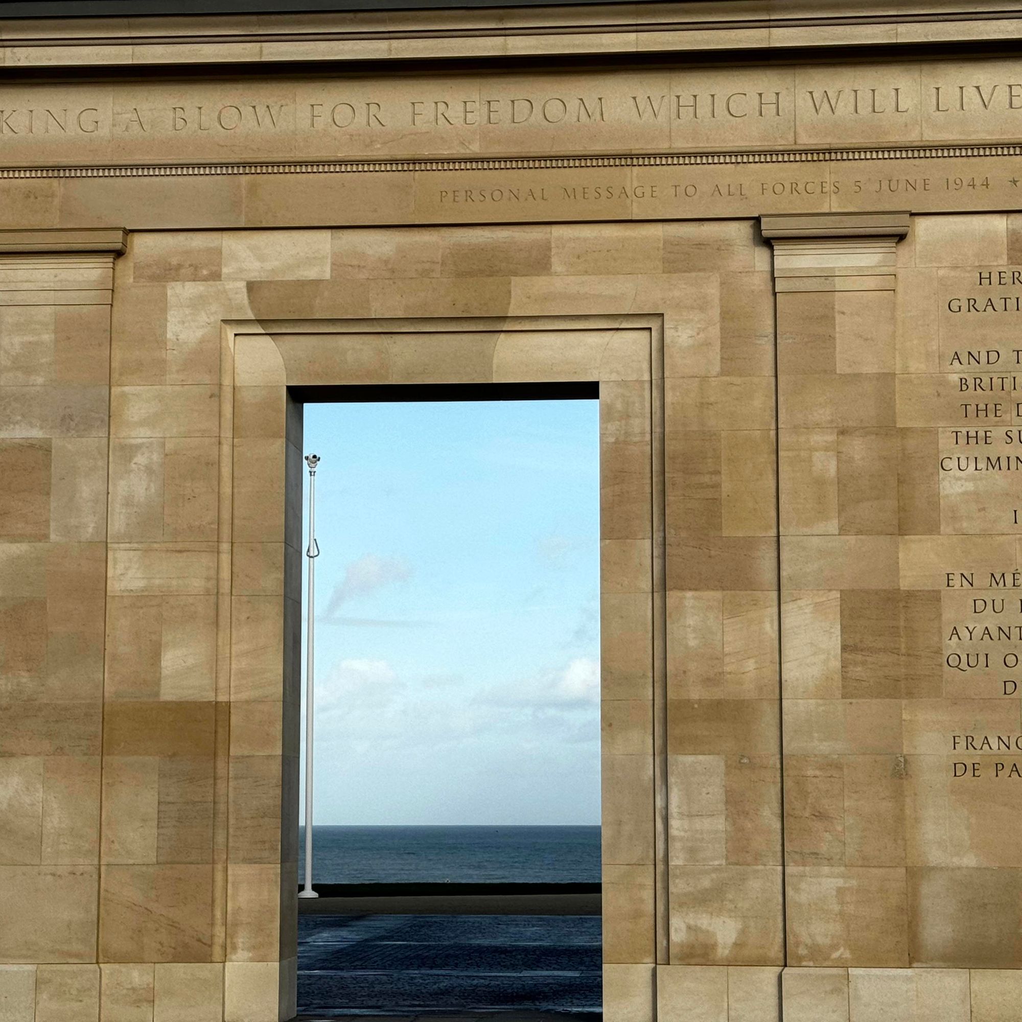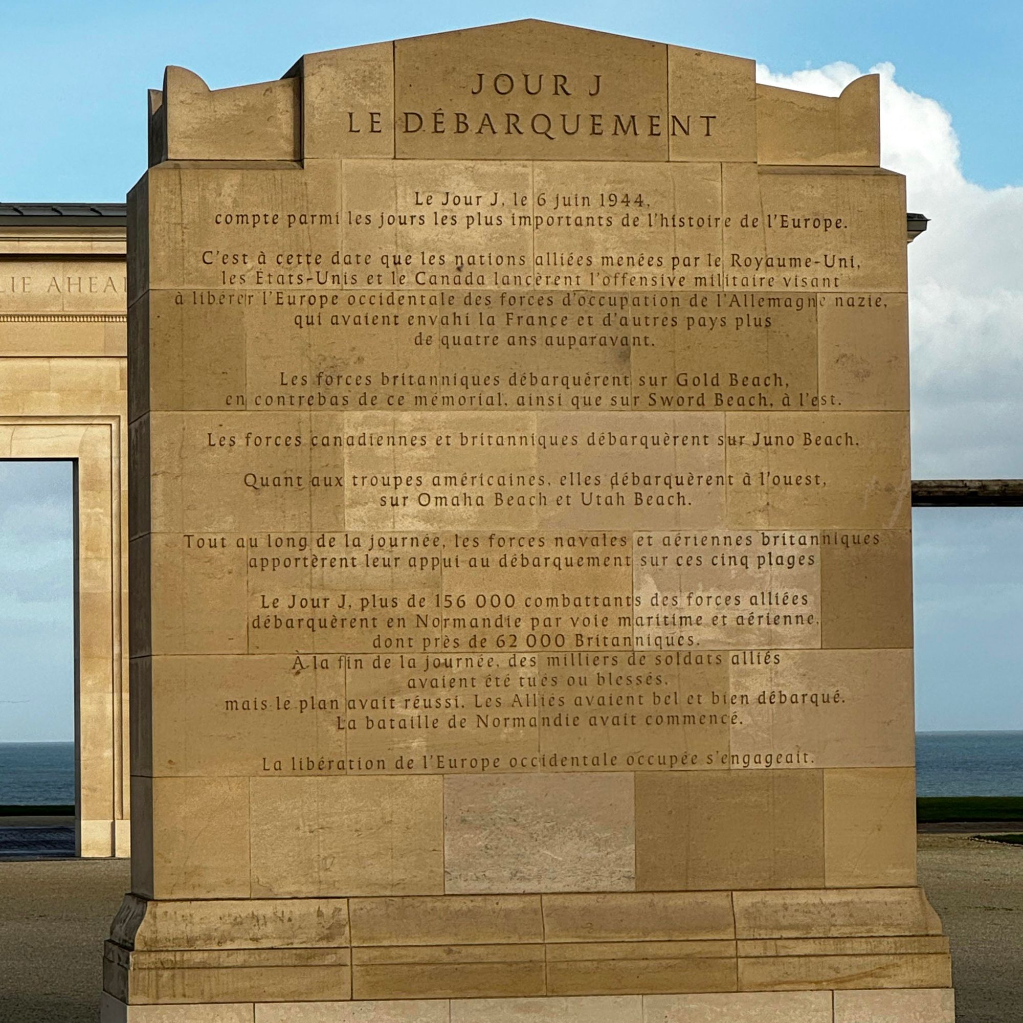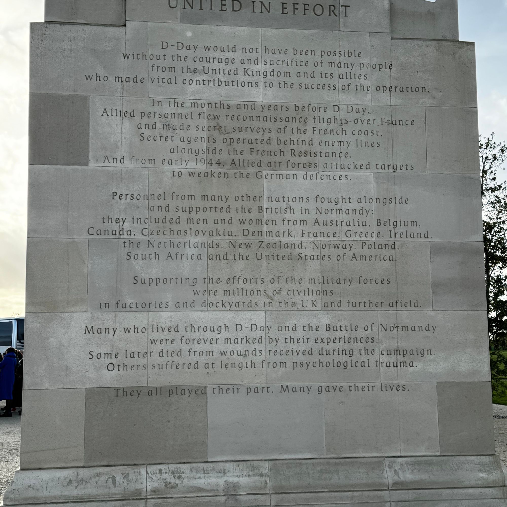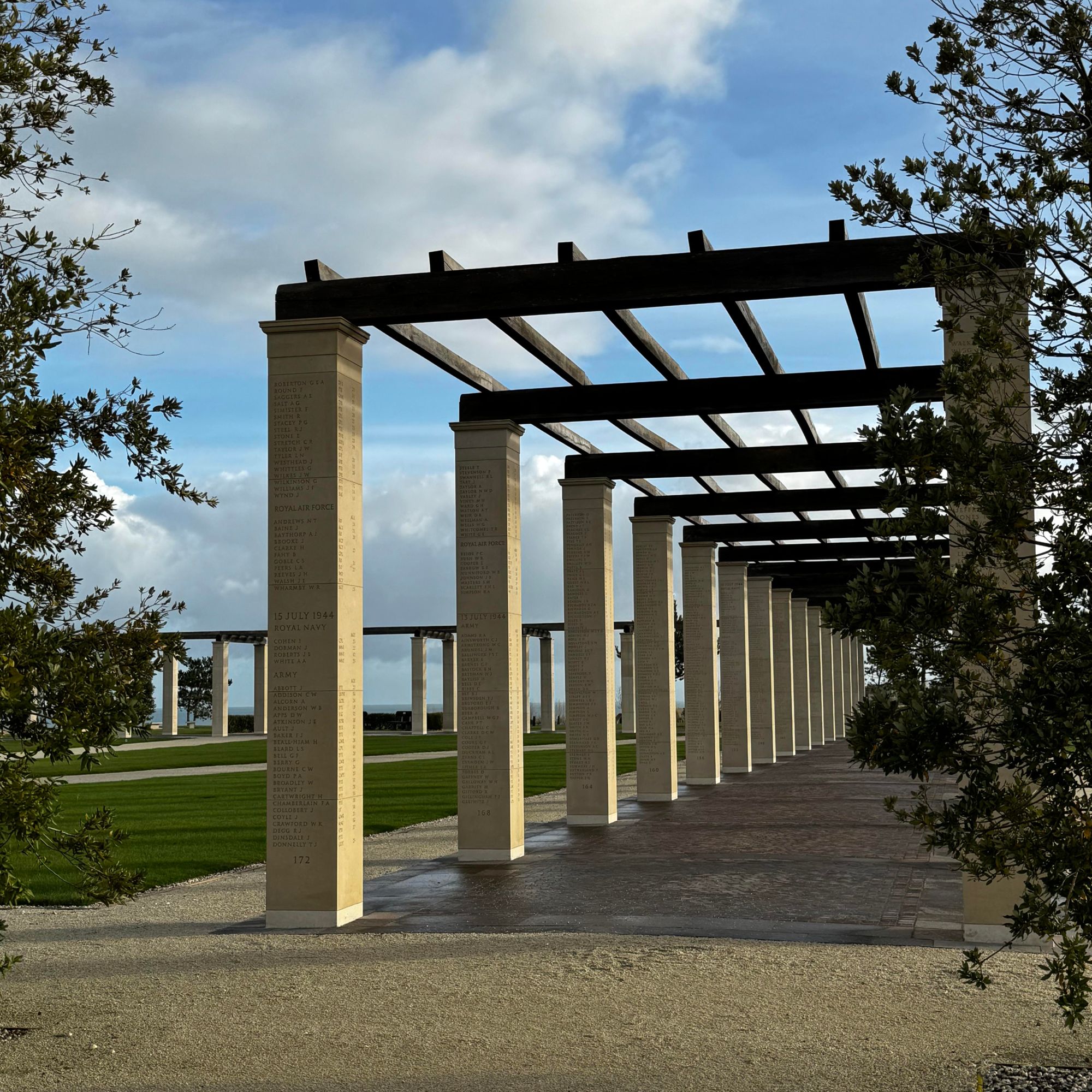 L'entrée est bordée de pierres décrivant la bataille de Normandie. Au centre se trouve un mur du Jour J où sont inscrits les noms des 1 746 personnes qui ont perdu la vie le 6 juin 1944. De chaque côté se trouvent 160 colonnes blanches sur lesquelles sont inscrits les noms de ceux qui sont morts les jours suivants, dans l'ordre chronologique, dans le sens des aiguilles d'une montre à partir du centre.