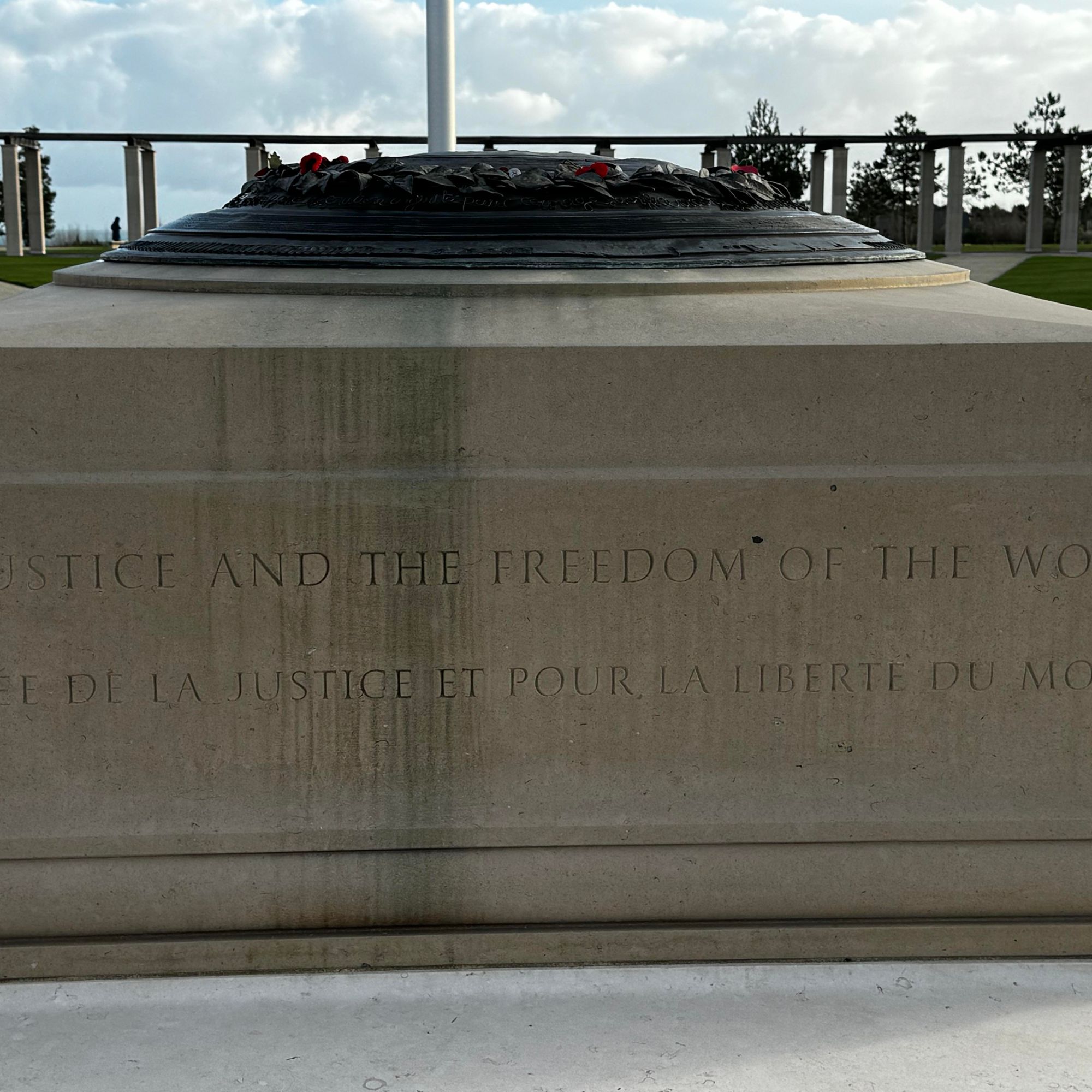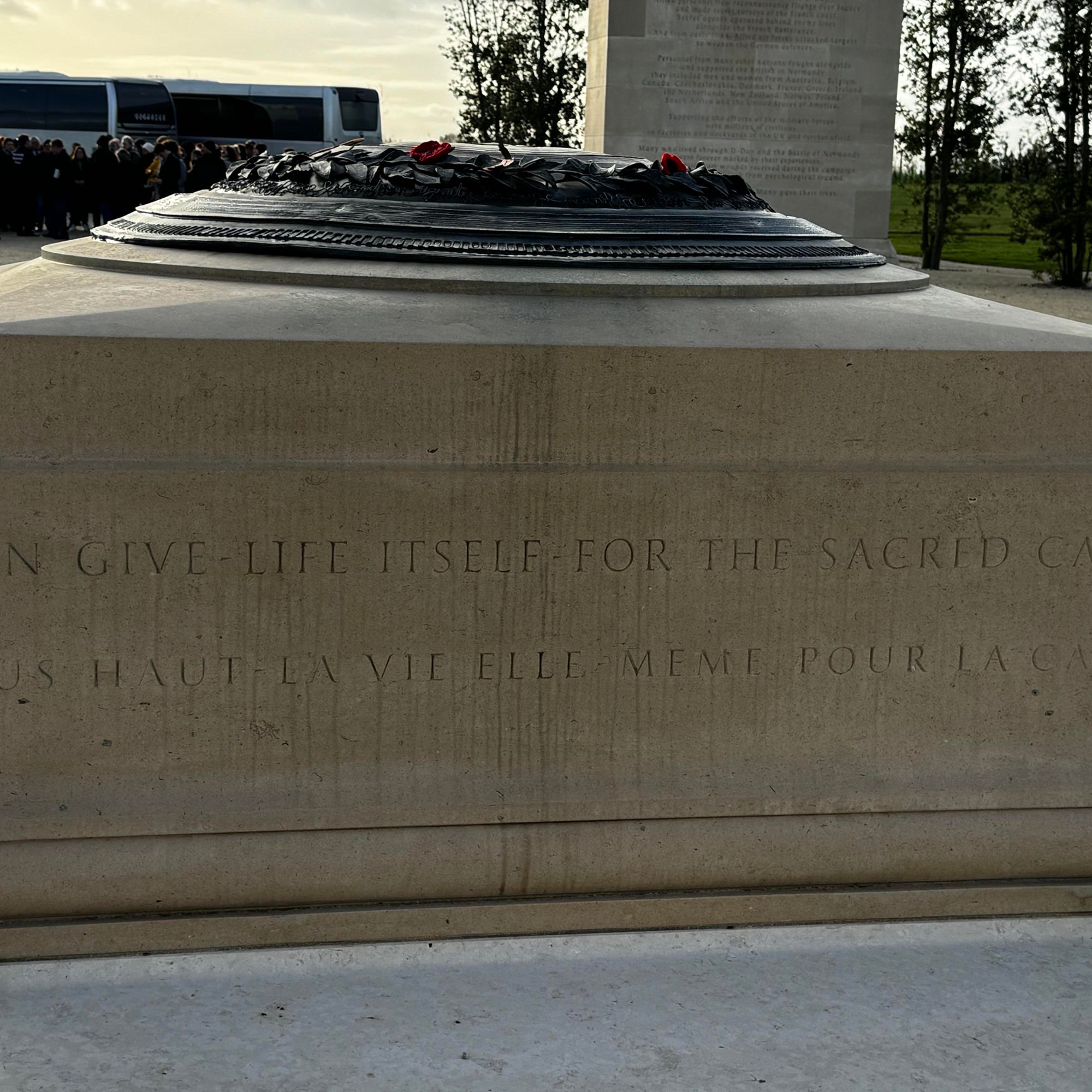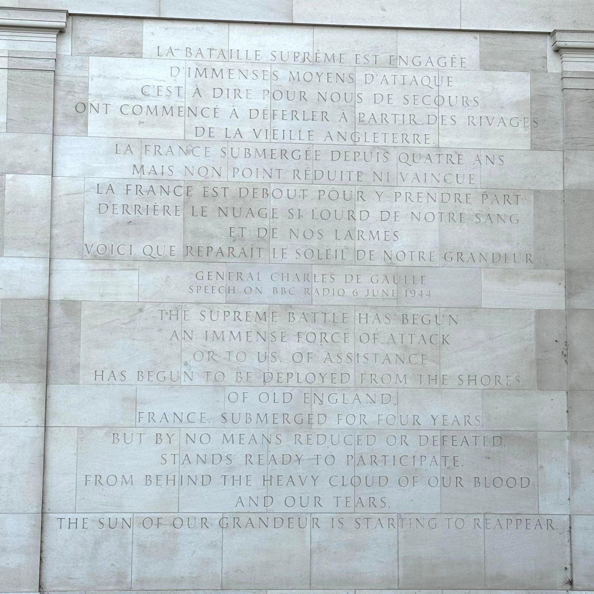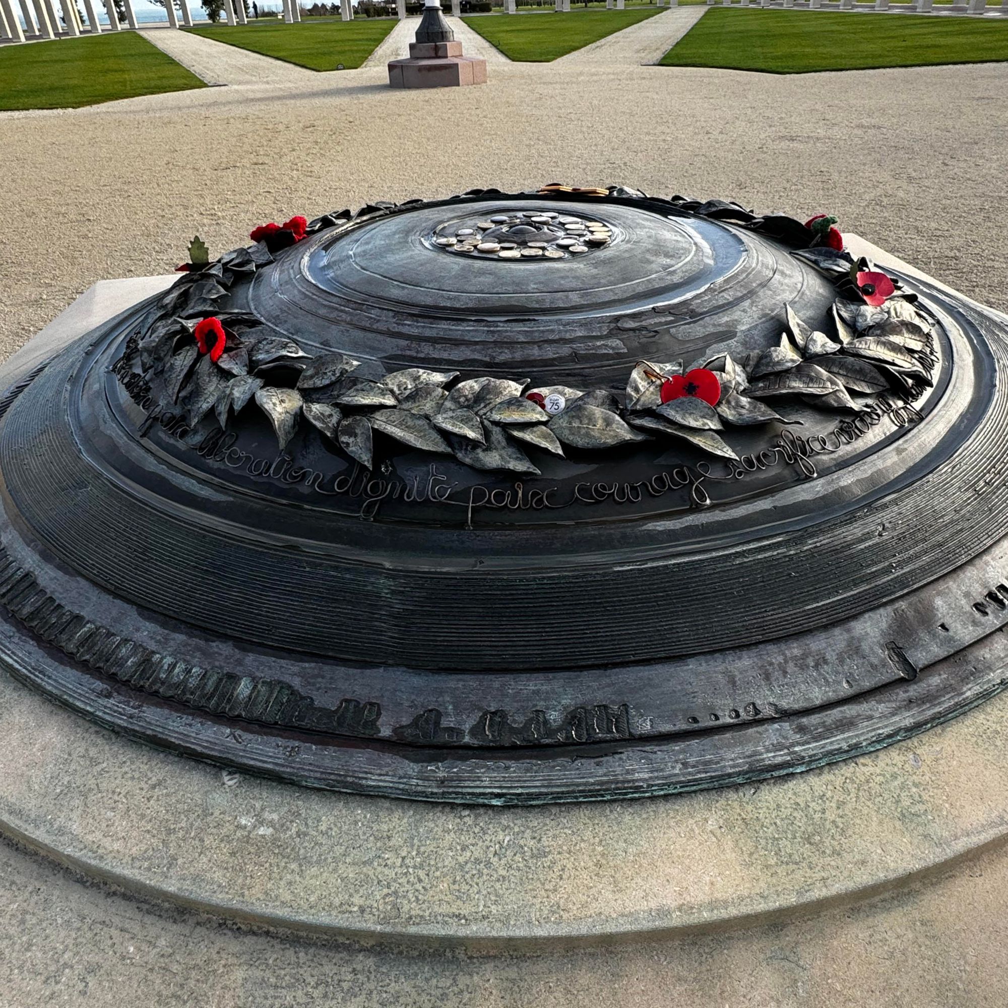 L'entrée est bordée de pierres décrivant la bataille de Normandie. Au centre se trouve un mur du Jour J où sont inscrits les noms des 1 746 personnes qui ont perdu la vie le 6 juin 1944. De chaque côté se trouvent 160 colonnes blanches sur lesquelles sont inscrits les noms de ceux qui sont morts les jours suivants, dans l'ordre chronologique, dans le sens des aiguilles d'une montre à partir du centre.