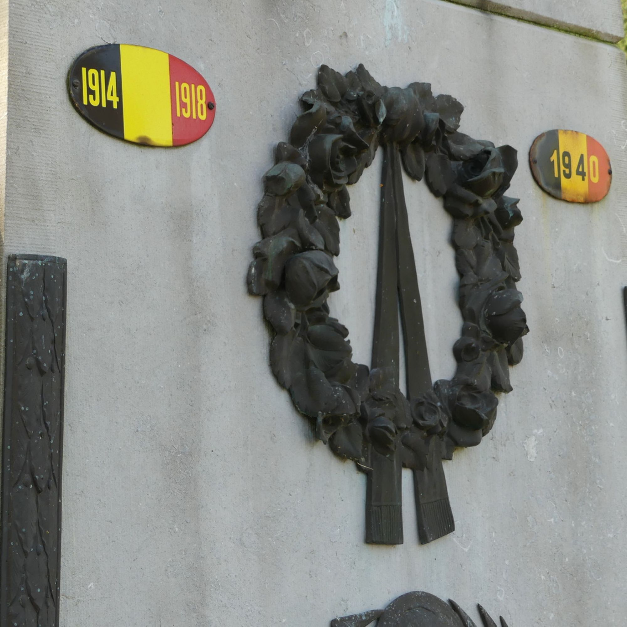 Monument aux morts en pierre bleue avec éléments en bronze.
