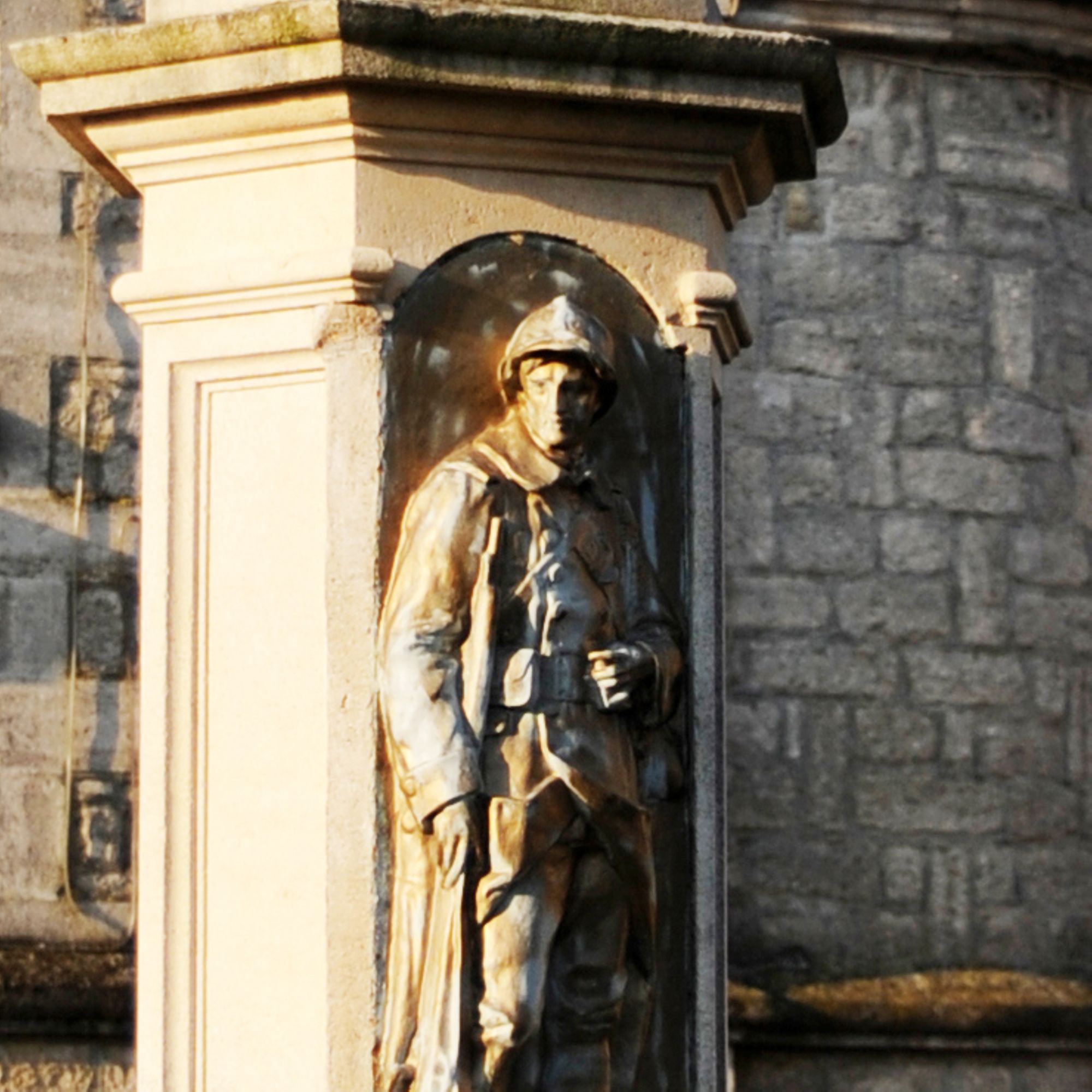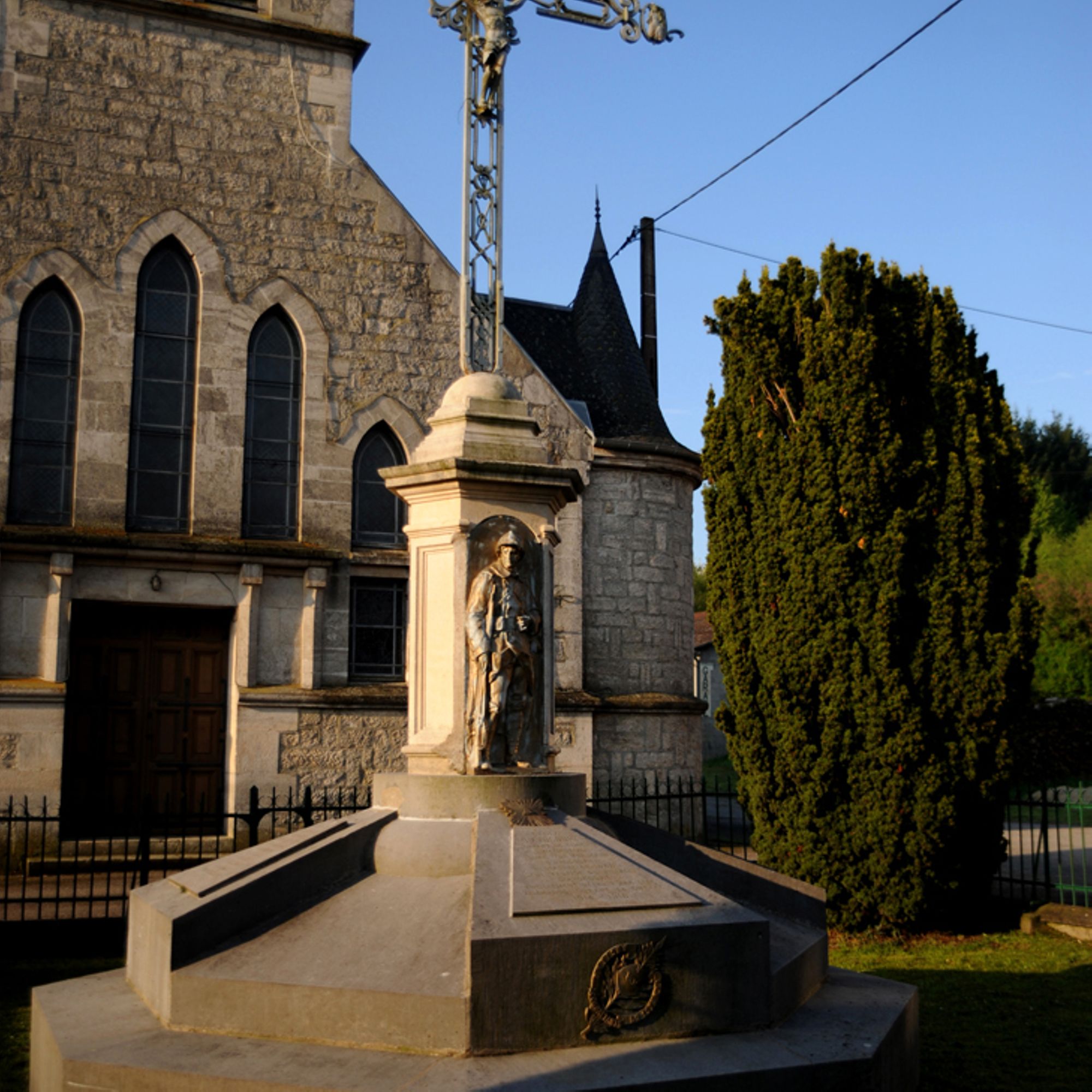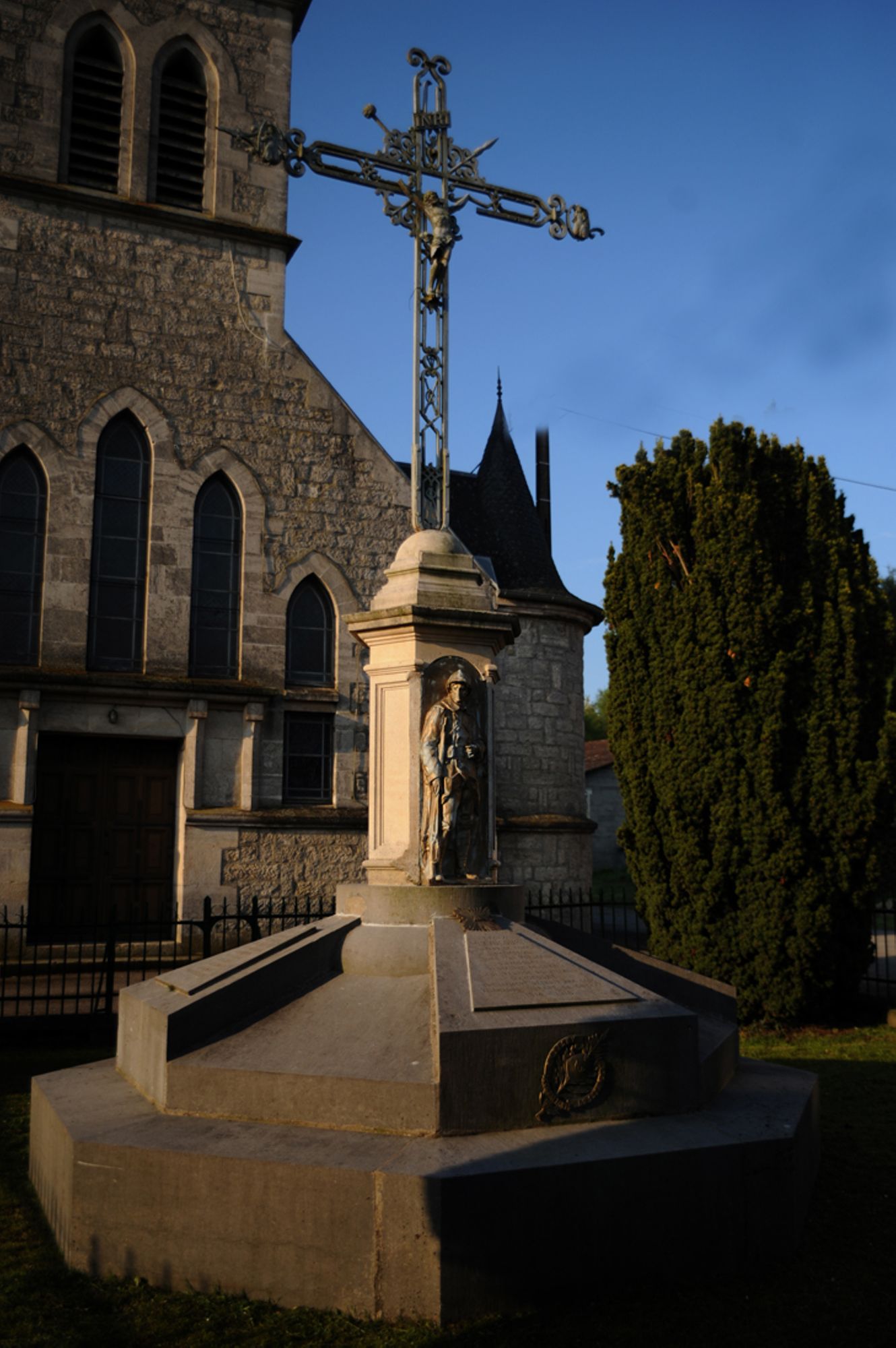 Le Monument, croix et fontaine honore un Soldat de la Grande Guerre et une base en granit porte des plaques gravées aux noms des MPLF, le texte de la citation de la commune à l’ordre de l’Armée ainsi qu’une palme offerte par les Anciens Combattants.