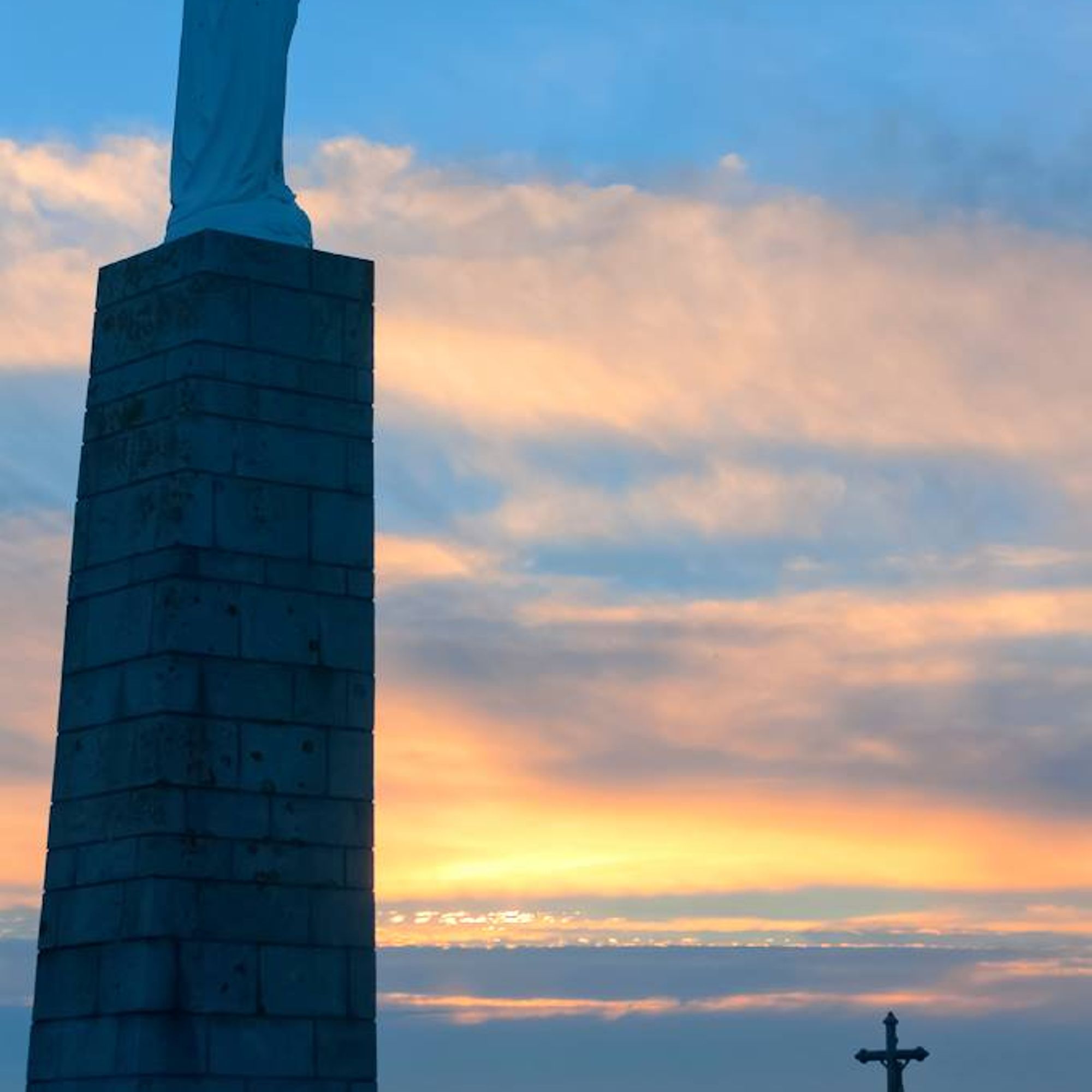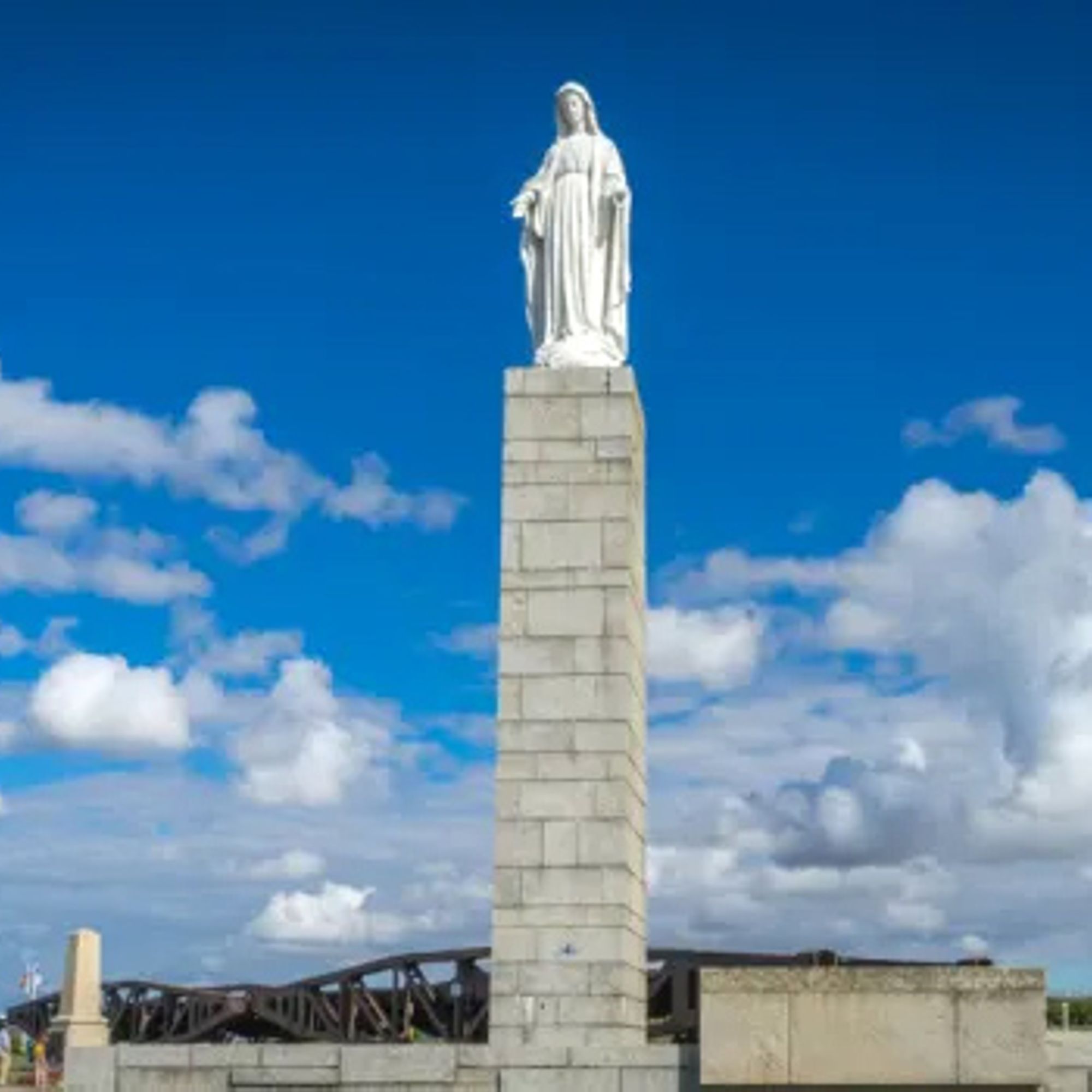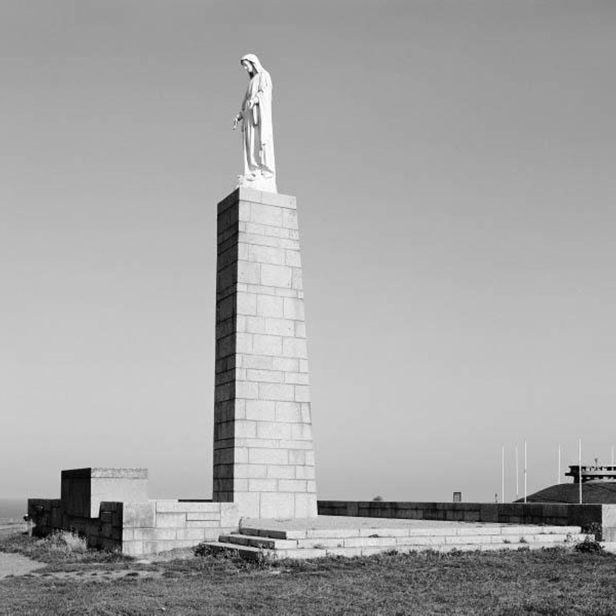 Une statue imposante de la Vierge Marie, située à 4,5 mètres au sommet d’un piédestal de granit de 8 mètres, commande une vue majestueuse sur les Arromanches et la mer depuis le bord de la falaise.