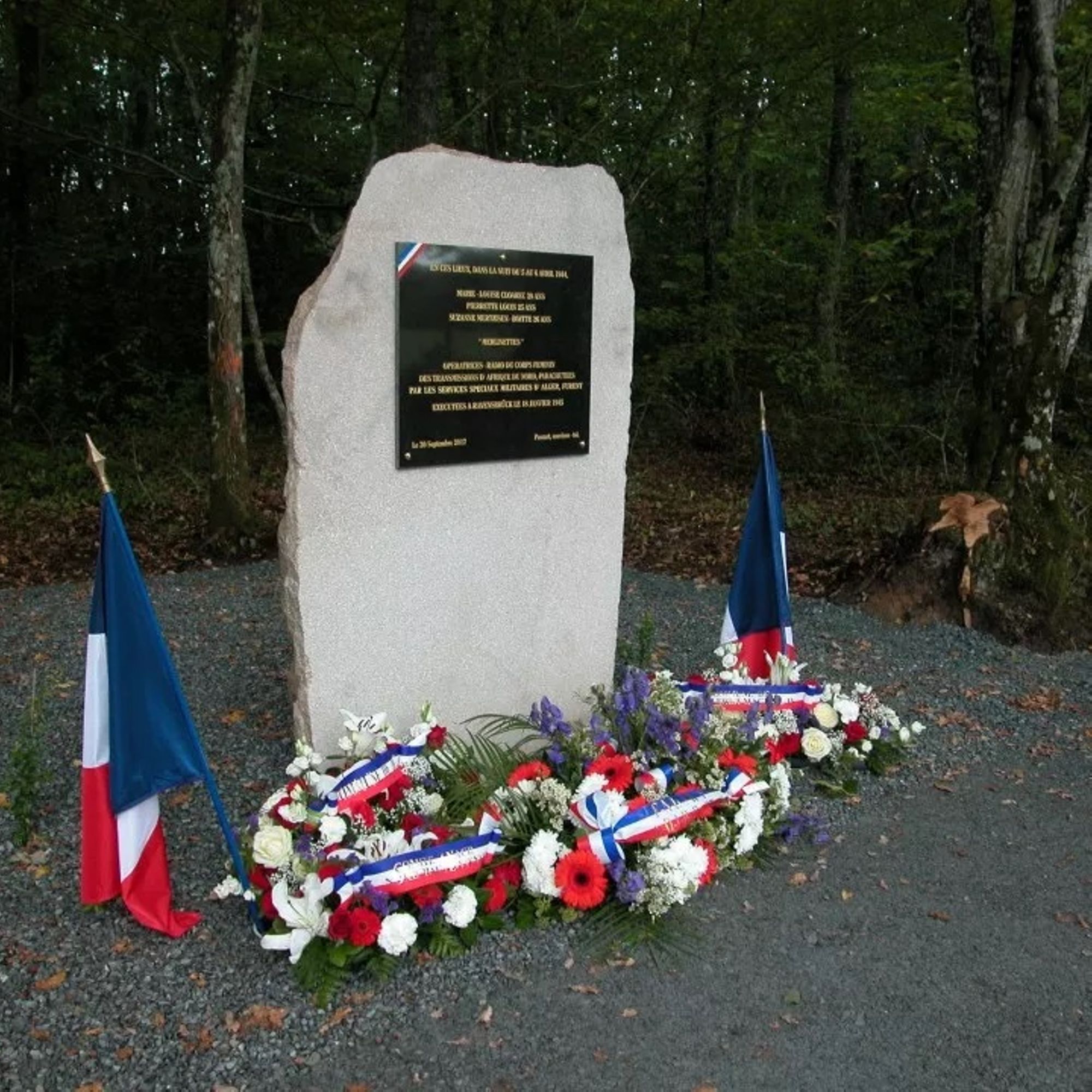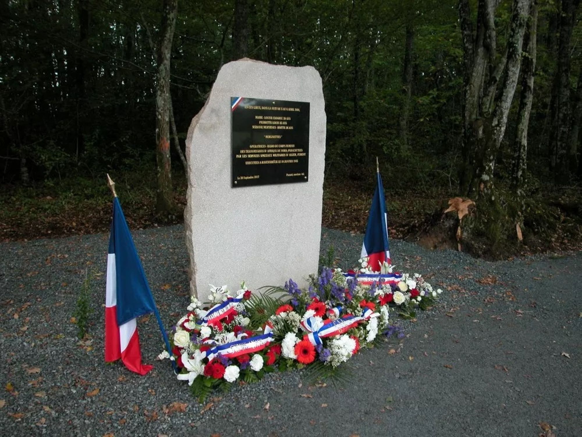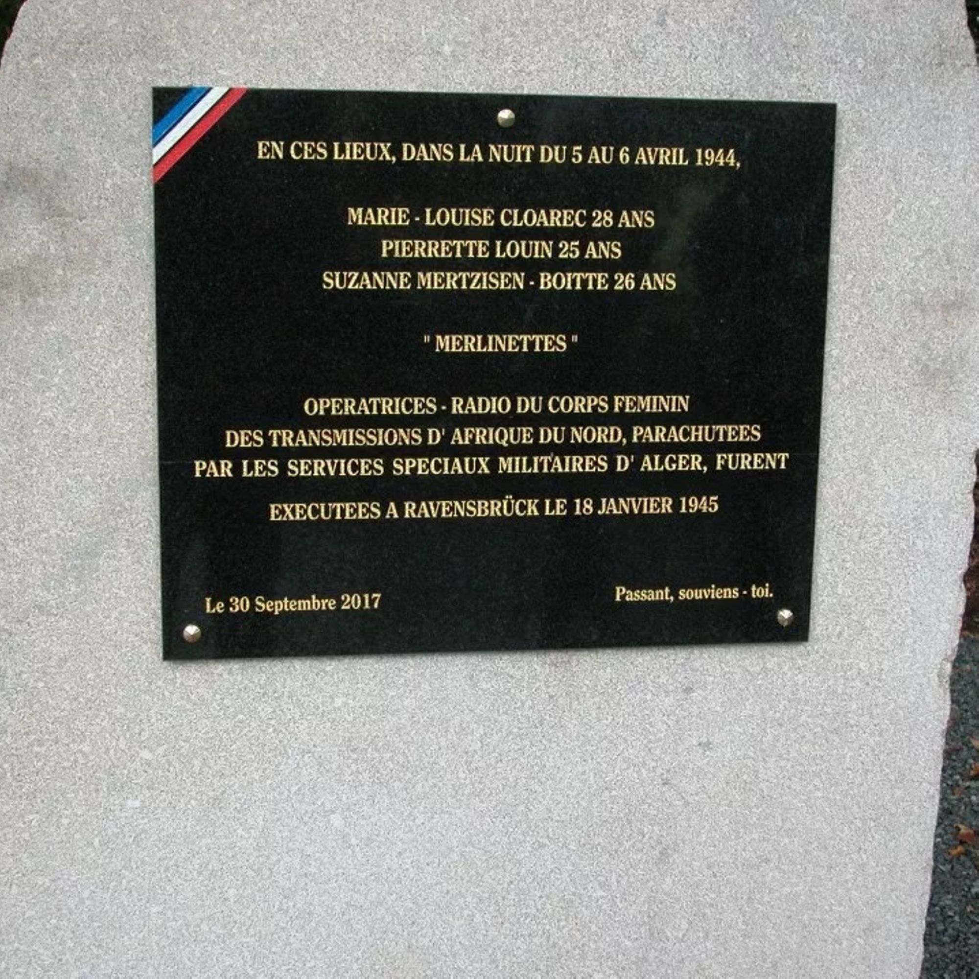 Stèle inaugurée en octobre 2017 en mémoire de trois " Merlinettes ", Résistantes, opératrices radio formées en Afrique-du-Nord, parachutées à Saint-Léger-Magnazeix dans la nuit du 5 au 6 avril 1944, en mission pour les services spéciaux militaires d'Alger, avant d'être arrêtées et déportées