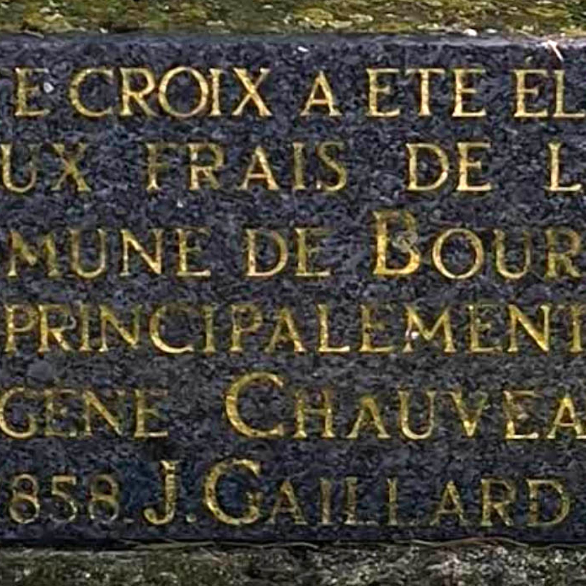 Tout en haut du fût, la croix est ornée d'une couronne d'épines. Une plaque y rappelle que « Cette croix a été élevée aux Frais de la Commune de Bouresse et principalement de M.Eugène Chauveau Fils - An 1858.