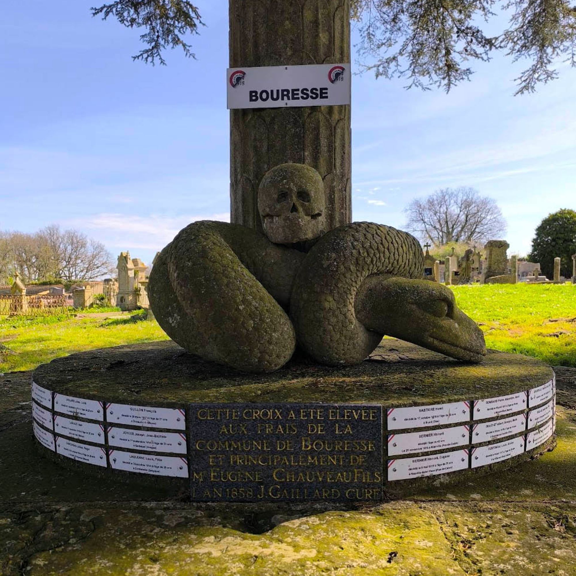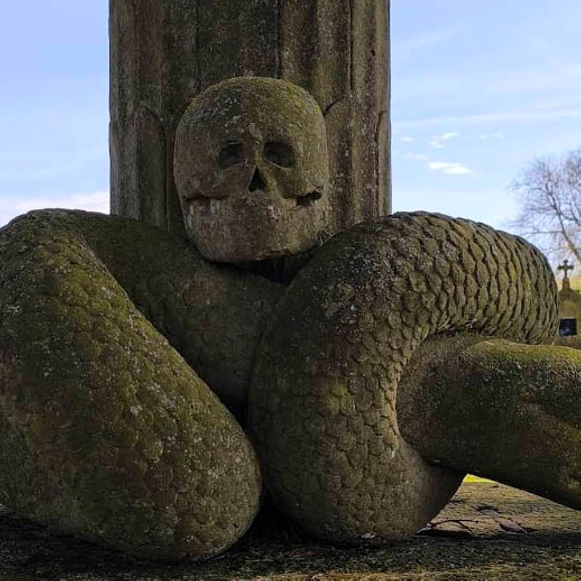 Autour du pied du fût de la croix, un serpent est représenté, lové et expirant; une tête de mort est posée sur son dos.